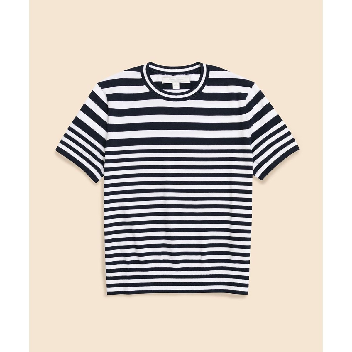コーディネートのポイントになるストライプ柄ショートスリーブセーター