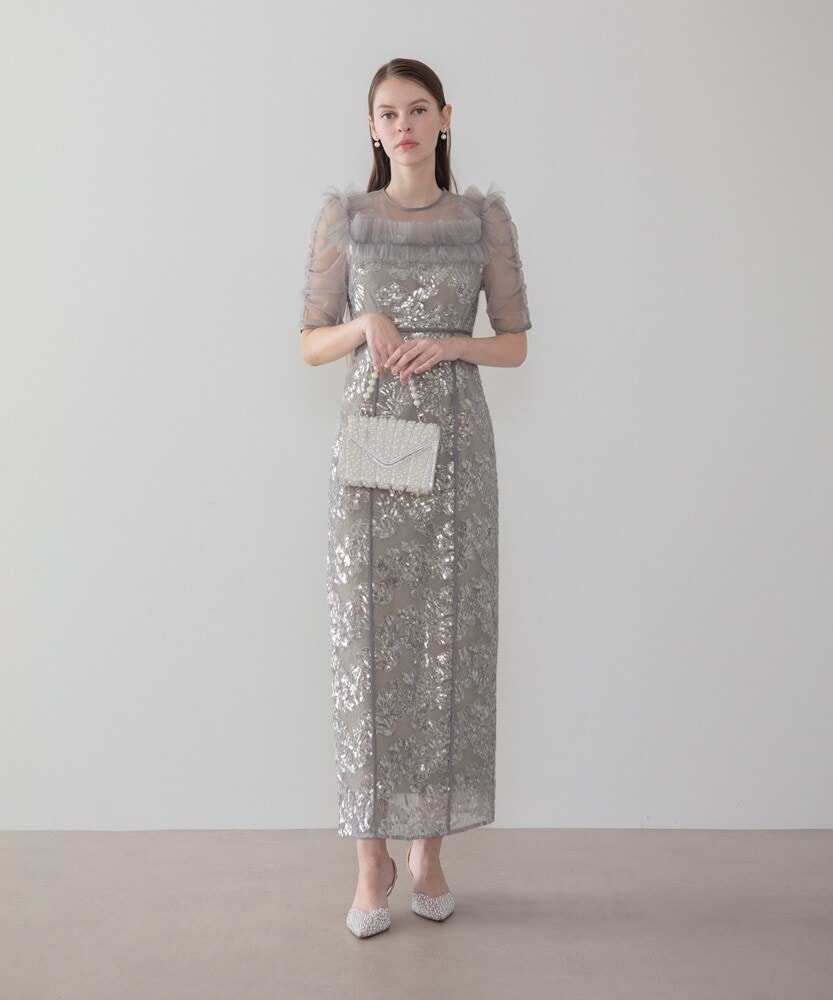 備考:チュールギャザーフリル / フラワーモチーフスパンコール刺繍(レース地) / Iラインシルエット / 裏地あり