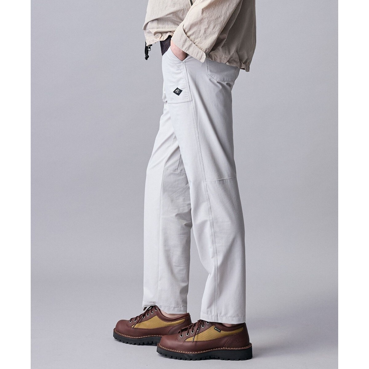 動きやすさを考慮したクライミングパンツ仕様です。股下には脚を広げやすいマチ(Zマチ)を配置しました。ウエストはベルト付きで、シルエットは足元に向かって細くなるテーパード型です。