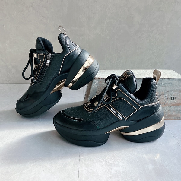 異素材を組み合わせたアッパーと、さりげなく輝くメタリックパーツが、足元にモードなアクセントを添えます。
