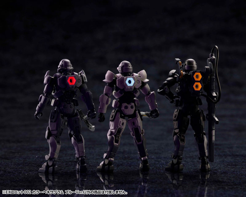 ■ヘキサギア世界の二大勢力の一方、リバティー・アライアンスをイメージしたブルーで成型されたヘキサグラムは、半クリアー成型とする事でガンメタルのフレームをはじめとした暗色の部品に装填してもしっかりとした発色を保ちます。