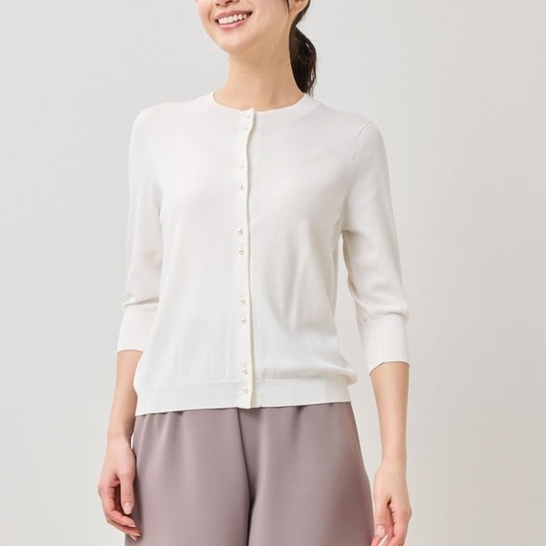フロントに並んだ煌びやかなパール調ボタンが上品な女性らしさを演出するカーディガン。手元をすっきりと見せる7分袖になっており、スタイリングにシーズンらしさをプラスします。26SSのトレンドカラーであるホワイトのスタイリングには欠かせないシリーズ。