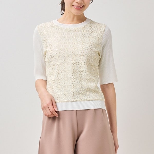 エレガントかつ高級感を演出する、メタリック糸を使用したレースがポイントのニットプルオーバー。スリーブや後ろ身頃はリブ素材で表情の変化をつけ、さらりと着こなせるデザインに仕上げました。