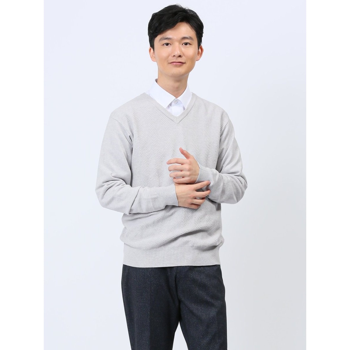 クロスストレッチ ヘリンボンジャガード Vネックニット