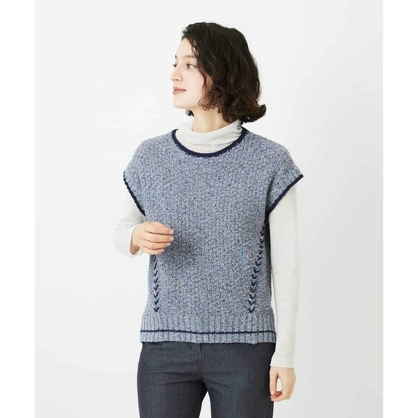 凹凸のある糸を使用し、表情豊かな素材感を楽しめる丸首ベストです。身頃は鹿の子編みで仕立て、脇部分には裏目編みを取り入れることで、編地の切り替えによる立体感とさりげない変化を加えています。衿の配色デザインや脇部分のハンドステッチがアクセントとなり、色使いと手仕事の温かみが感じられる、他にはない一枚に仕上げました。