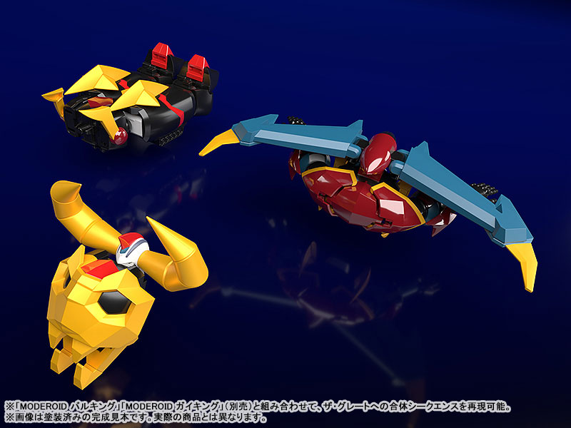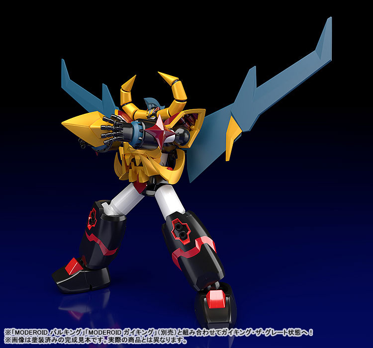 TVアニメ『ガイキング LEGEND OF DAIKU-MARYU』より、空を駆ける炎の巨人「ライキング」がプラスチックモデルになって登場!劇中さながらのスタイルで造形されたリアルモデル。各関節可動。スカルハーケン、交換用手首、専用台座が付属。腕部カウンタークロスは脱着可能。上半身は再現用パーツを使用し「ライキング パート1」に変形可能。別売の「ガイキング」「バルキング」と組み合わせる事で、究極の炎の巨人「ガイキング・ザ・グレート」への合体及び合体シークエンスを再現する事ができます。青、赤、白、黒、金の5成形色と彩色済みパーツおよびシールにより、組み立てるだけでイメージに近い色分けを再現できます。