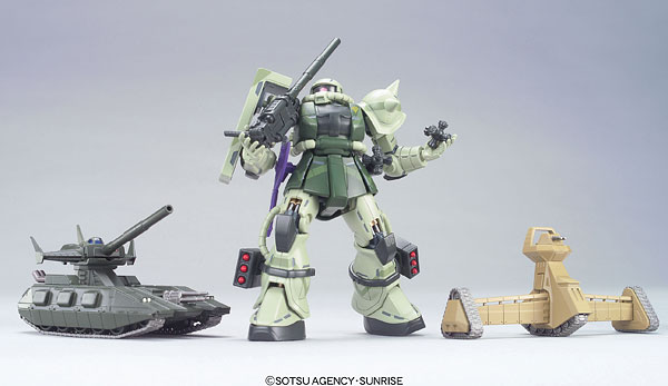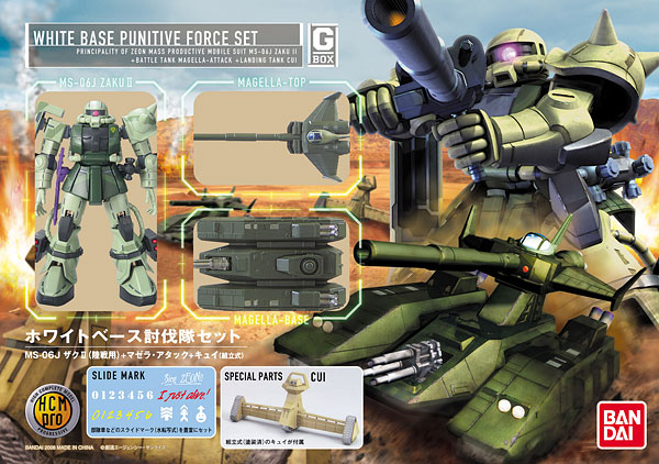 ガルマの仇討ちのため、地球へ派遣された“ホワイトベース討伐隊”が遂にハイコンプロに勢揃い!“MS-06J ザクII(陸戦用)”と“マゼラ・アタック”そして初めてキット化された“キュイ”のセット。