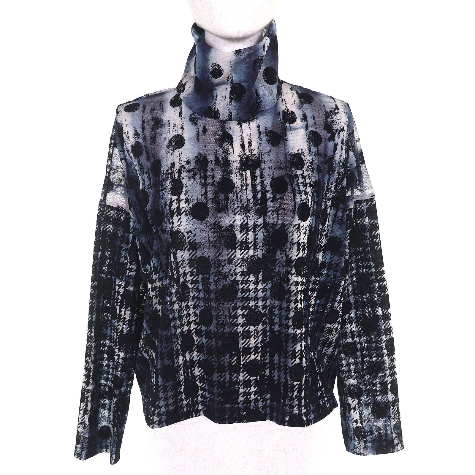 極美品★Y's ワイズ YM-T20-676 千鳥格子 水玉 フロッキープリント ハイネック 長袖 トップス ネイビー ブラック 2 日本製 正規品 レディース【中古】