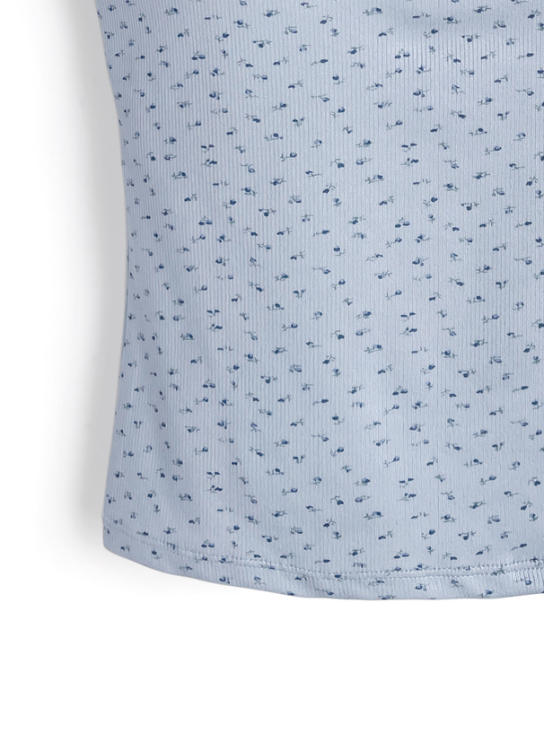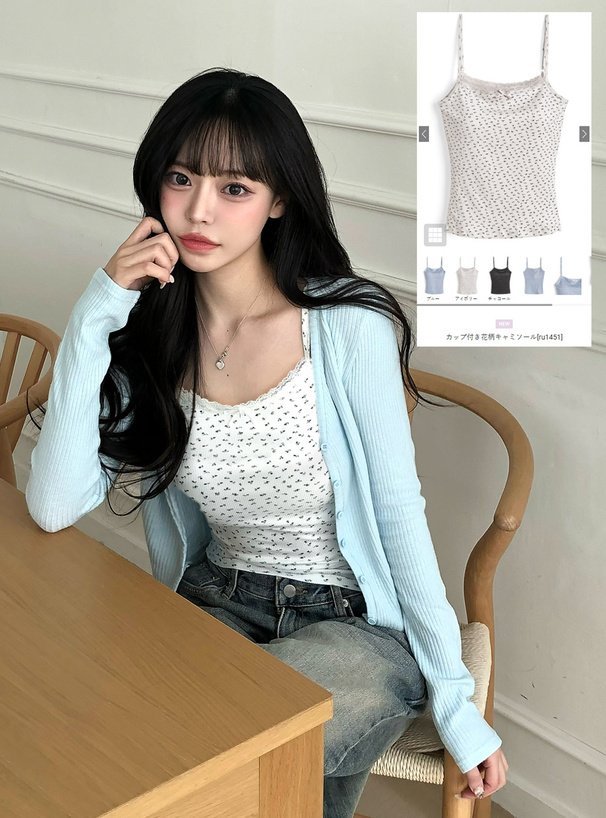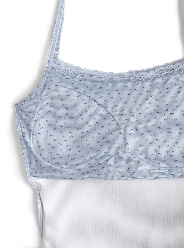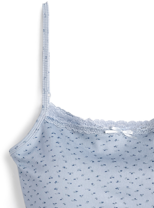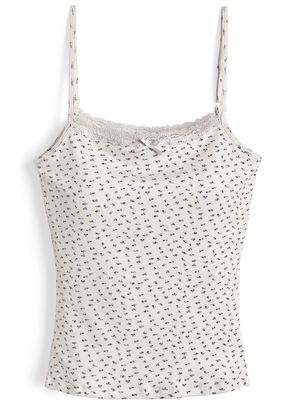 小さめのフラワー柄をあしらった可憐な印象漂うキャミソール。