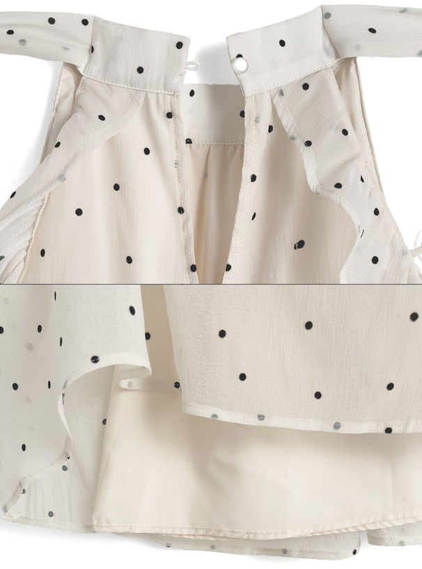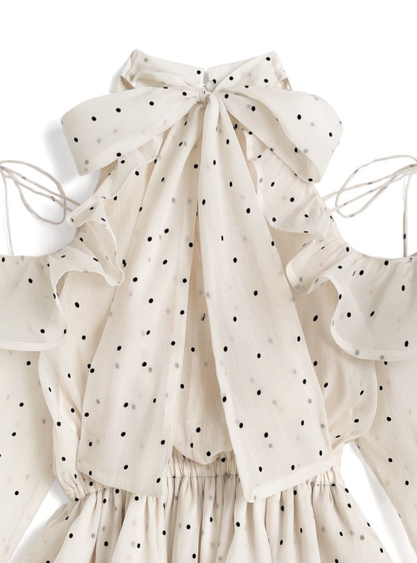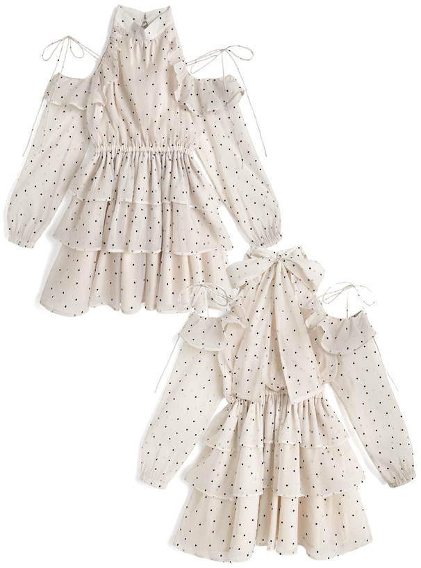 ハリのあるシアー素材にフロッキーの水玉柄をのせたミニワンピース。