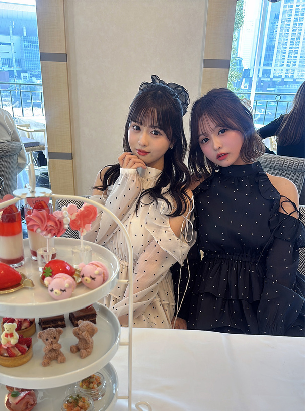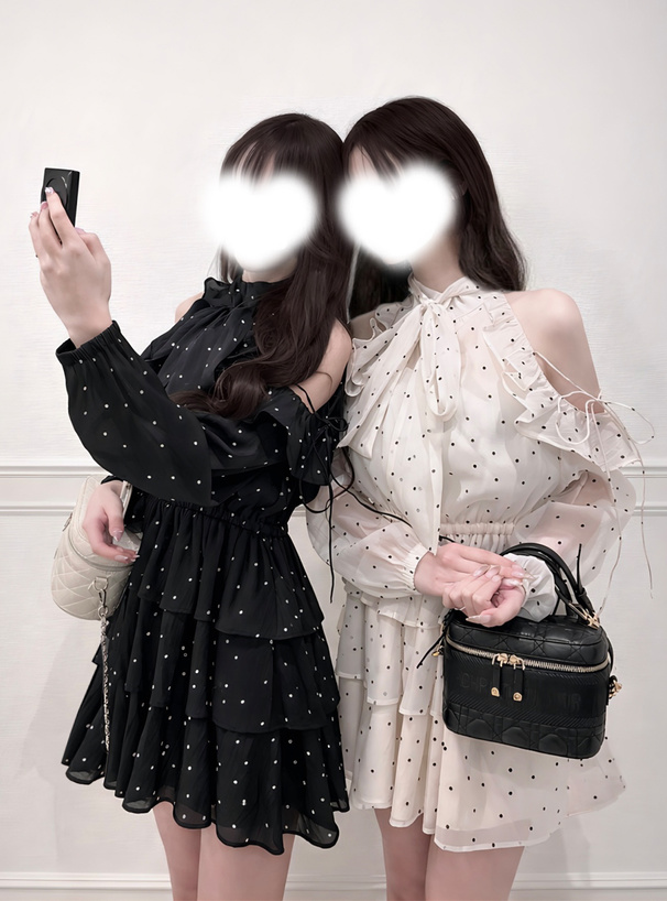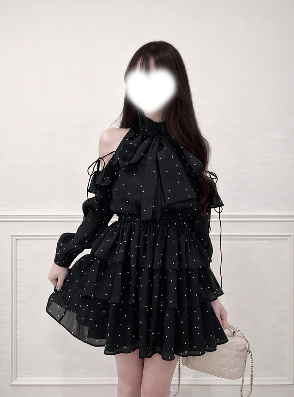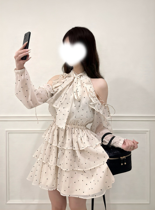 肩やネックのリボンが顔まわりを華やかに印象付けるポイント。
