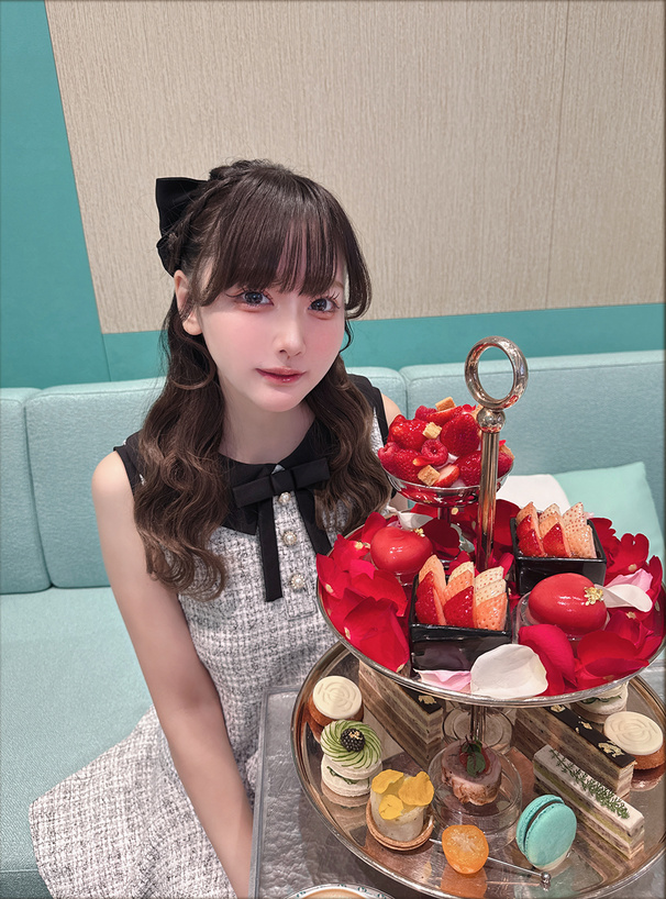 襟デザインできちんと感がありつつ、リボンやパールボタンをあしらい華やかさをプラス。