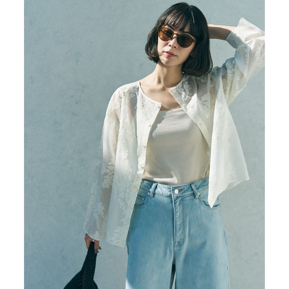 ■デザインオリジナル柄の刺繍をあしらったシアー素材を使用し、軽やかな雰囲気に仕上げた一枚。シンプルなシルエットでさまざまなスタイリングに取り入れやすく、デイリーから特別なシーンまで幅広く活躍します。前後どちらを前にしても着用できる2WAY仕様で、カーディガンとしてもプルオーバーとしても着回しが可能です。