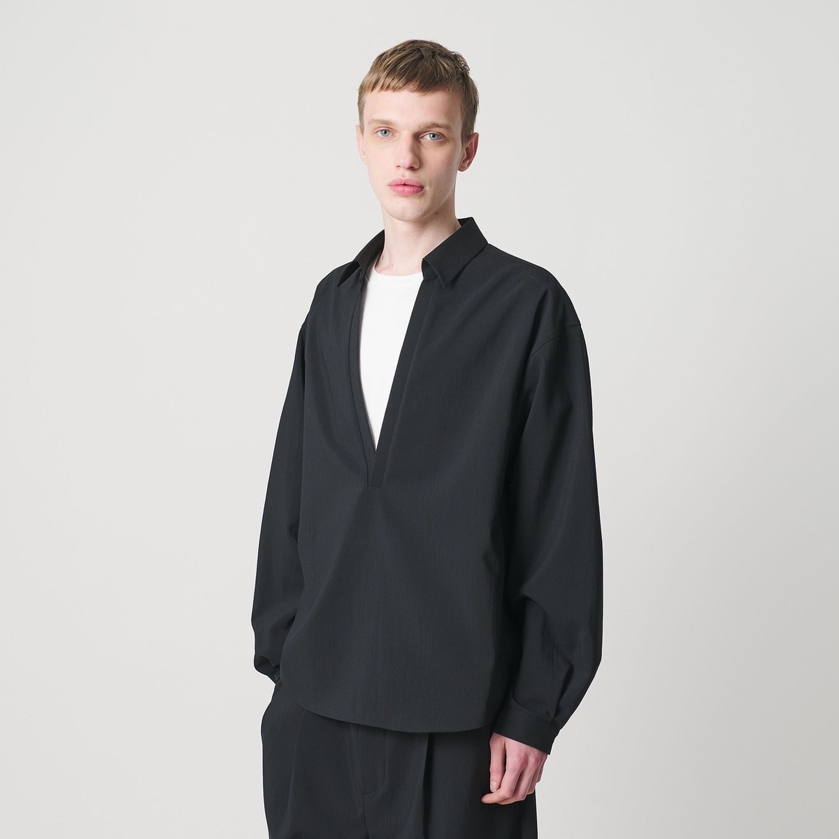 ウールライクなキレイ目の素材感ながらも麻のような肌離れの良さが特徴のプルオーバースキッパーシャツ。