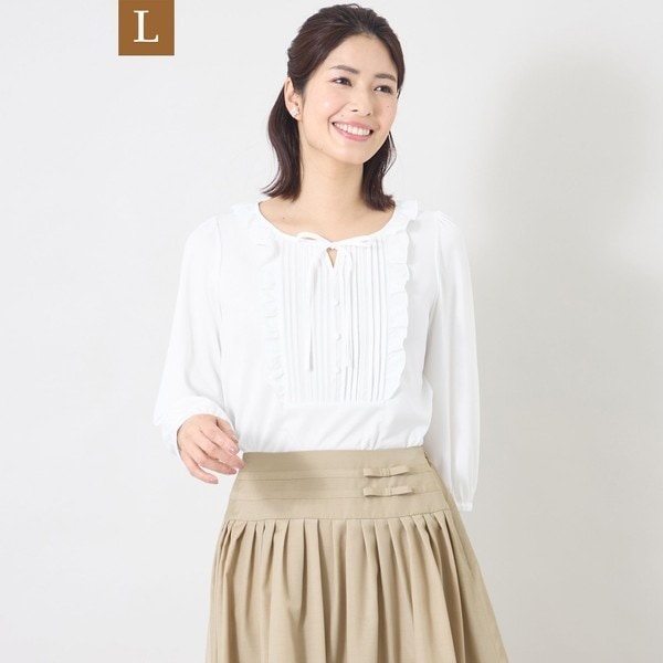 前身頃のヨーク部分に、フリル・タック・細はしごレースを施し、ブラウスのような華やかな表情に仕上げました。伸縮性があるため着心地が良く、シワになりにくいのも嬉しいポイント。きちんと感と快適さを兼ね備えた、デイリーからきれいめスタイルまで幅広く活躍するカットソーです。