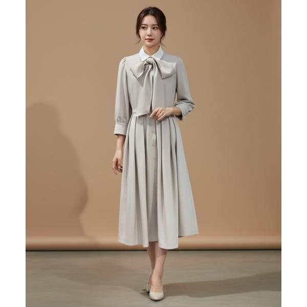 【毎シーズン大人気の定番ワンピースが、リボン付きでさらに可愛くアップデート】【Point】・首元の存在感あるリボンとホワイトの衿元が、顔まわりを華やかに演出するクラシカルなワンピース。・フロントボタン仕様で着脱しやすく、縦ラインを強調してすっきり見えも叶えます。・ウエスト切替&共布ベルト付きで、自然にスタイルアップが叶う美シルエット。・ふんわりとした袖デザインと、くるみ釦をあしらったカフスが女性らしいアクセントに。・バックウエスト部分はゴム入りなので着心地の良さも魅力。ケア方法:ドライクリーニング透け感:なし裏地:あり伸縮性:なし光沢感:なし生地の厚さ:中肉