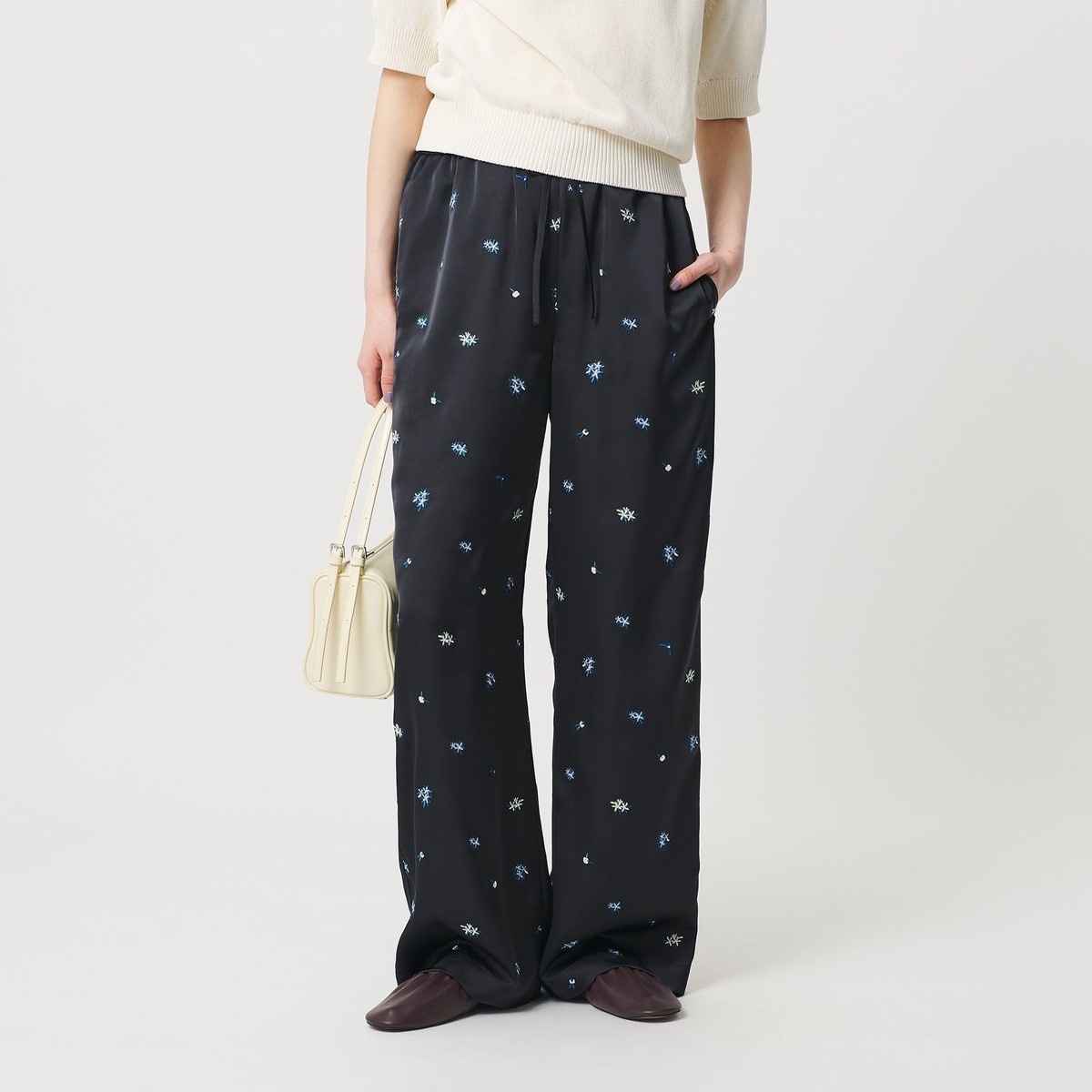 小花柄のエンブロイダリーが目をひくイージーパンツ。