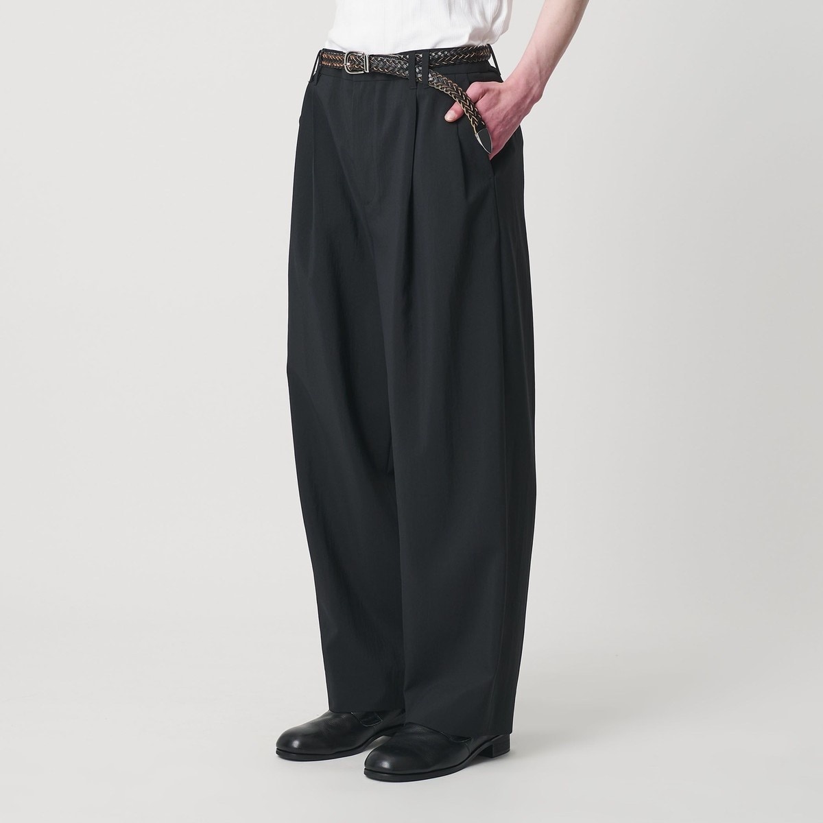 ウールライクなキレイ目の素材感ながらも麻のような肌離れの良さが特徴のワイドパンツ。