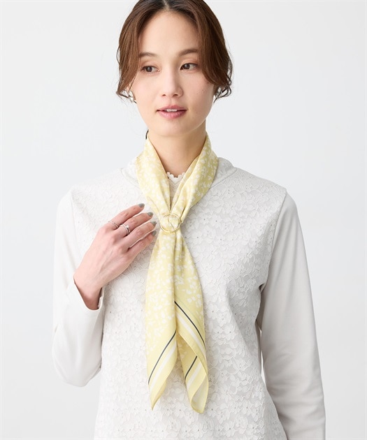 ボタニカル風の絵柄と配色ラインがエレガントな印象を与えるスカーフ。