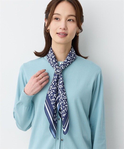 ボタニカル風の絵柄と配色ラインがエレガントな印象を与えるスカーフ。