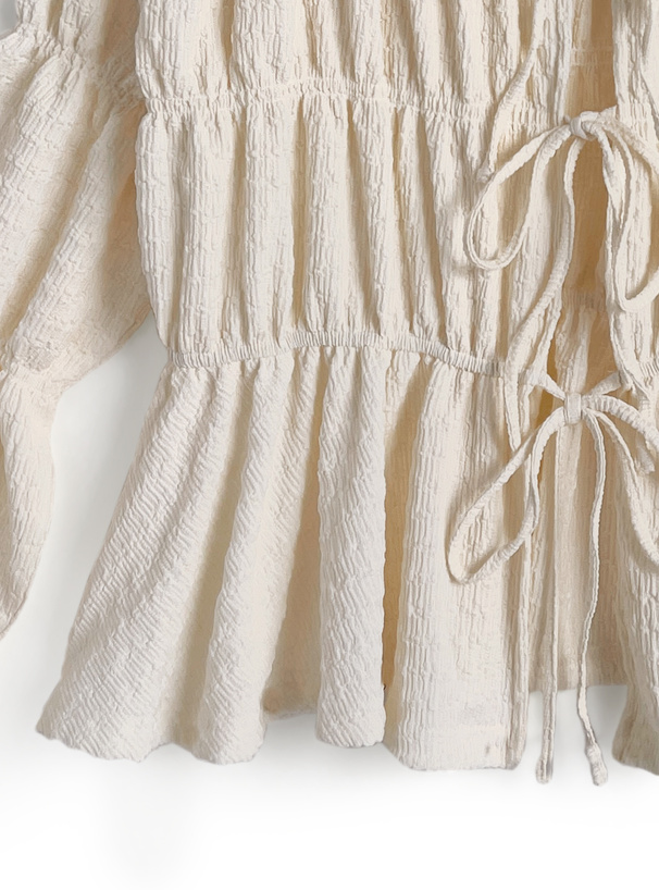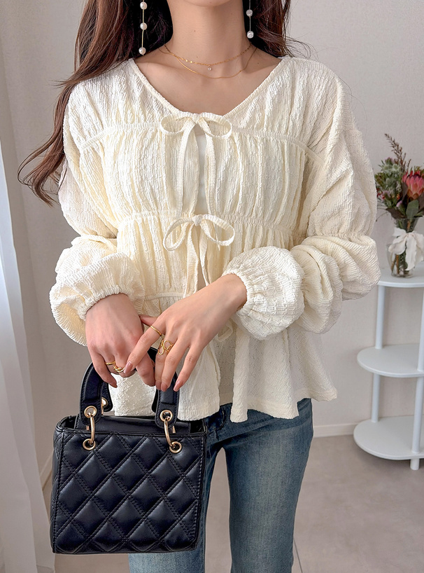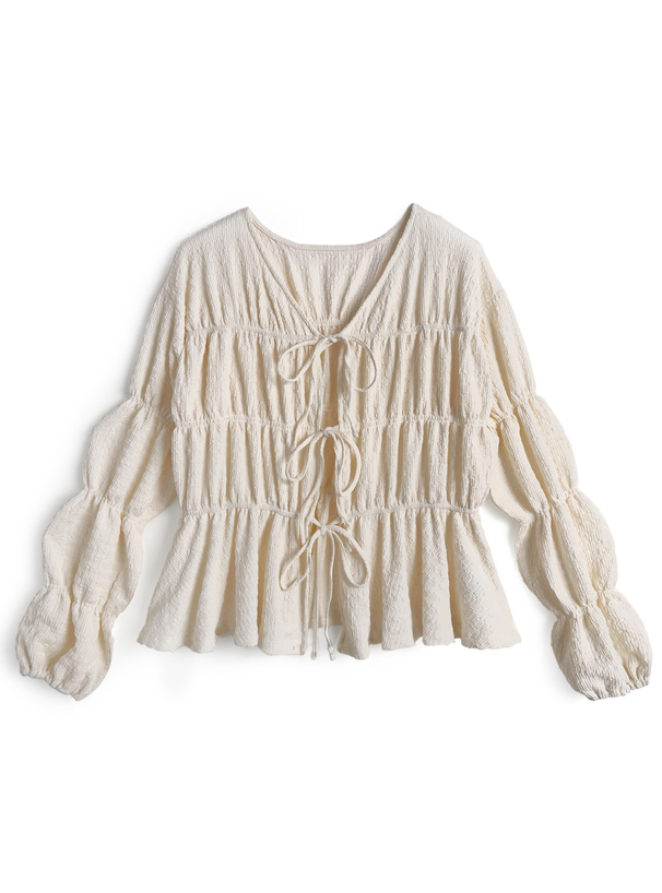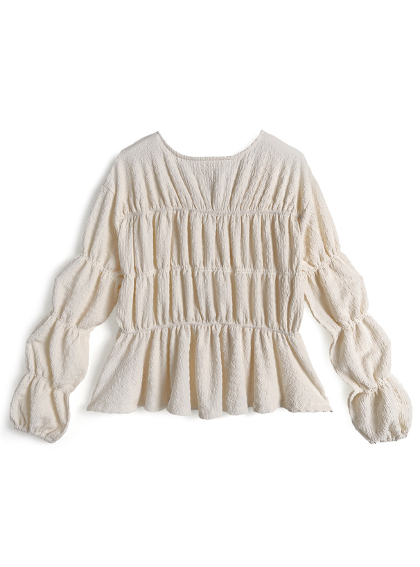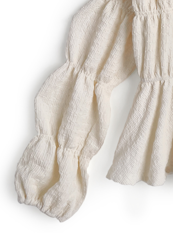 ギャザーを寄せたふくらみのあるシルエットが女性らしさを引き立てる。