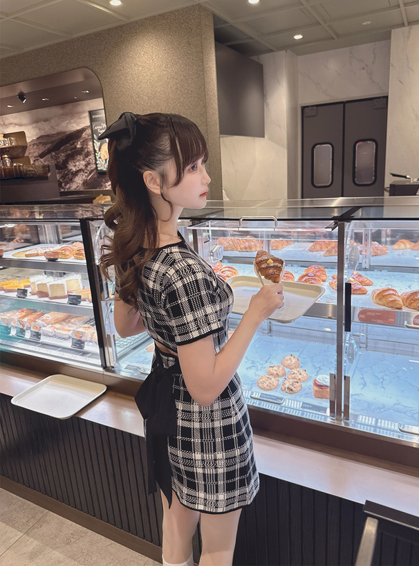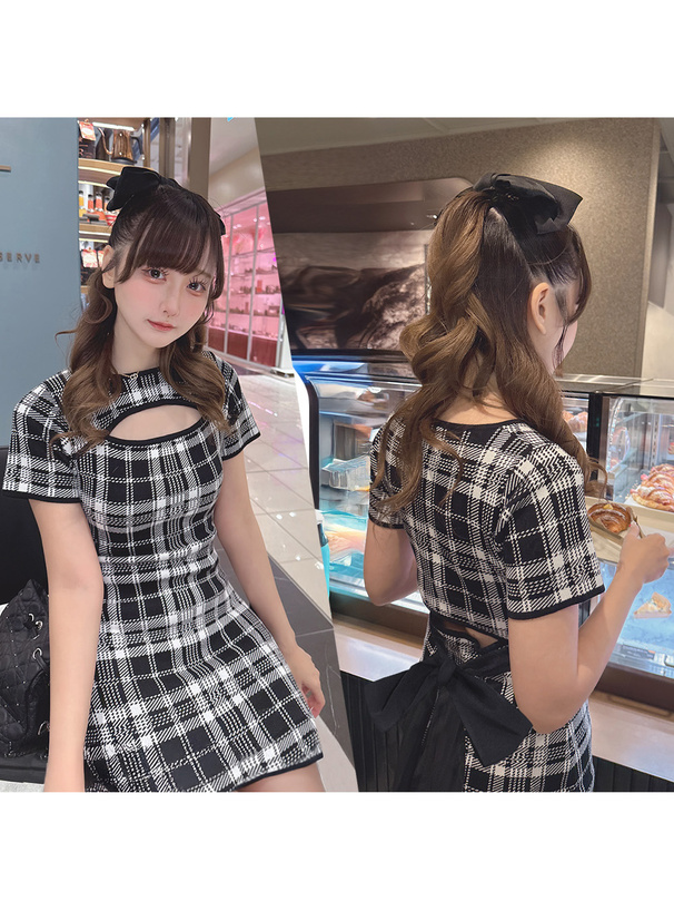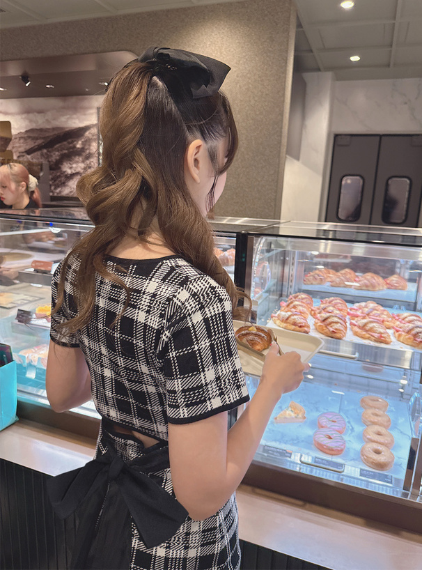 バックには異素材リボンをあしらうことで、後ろ姿もガーリーな仕上がりに。