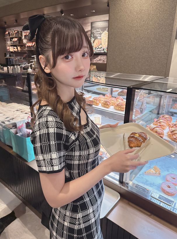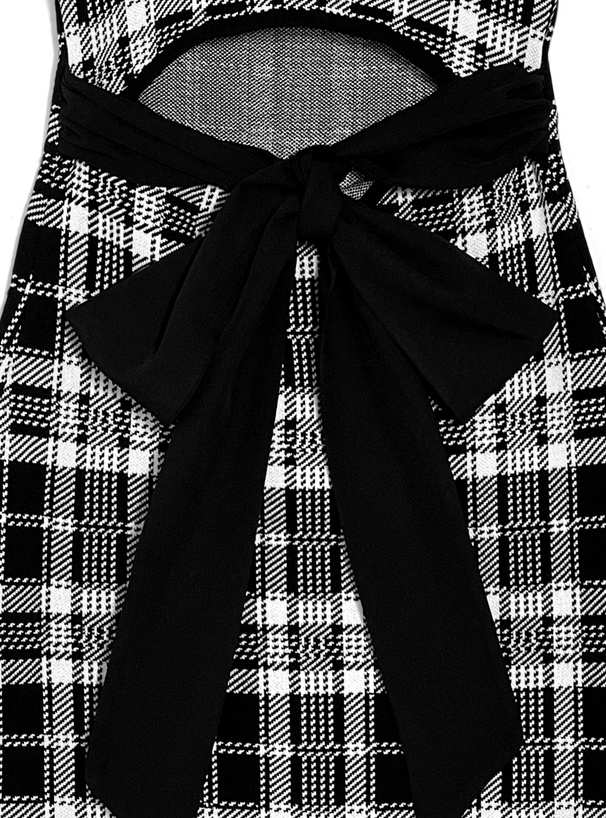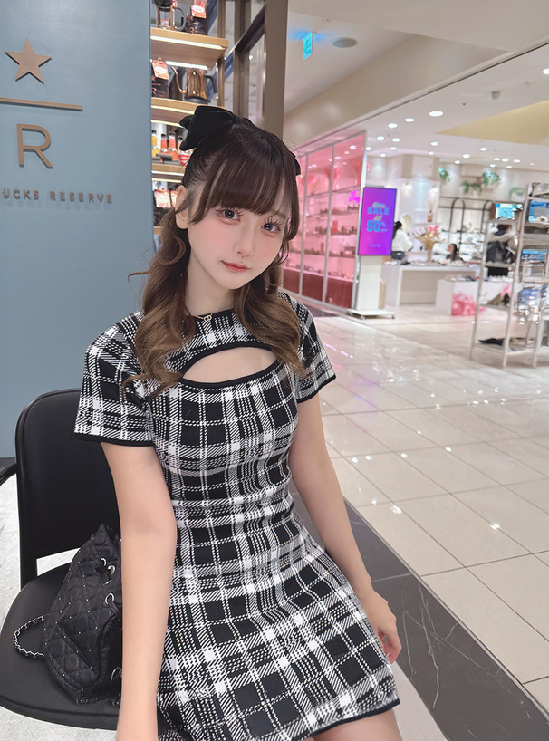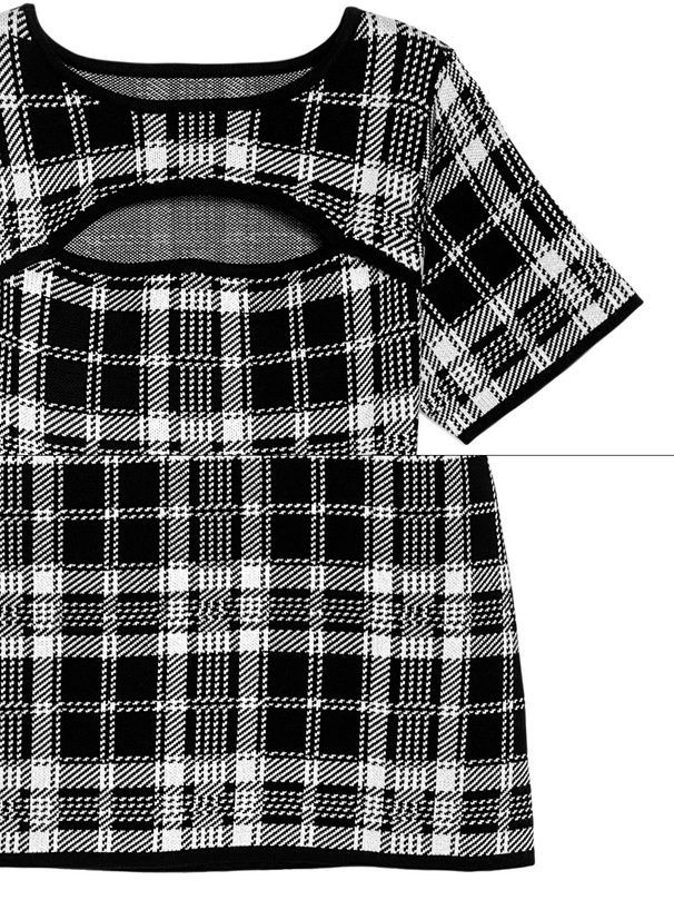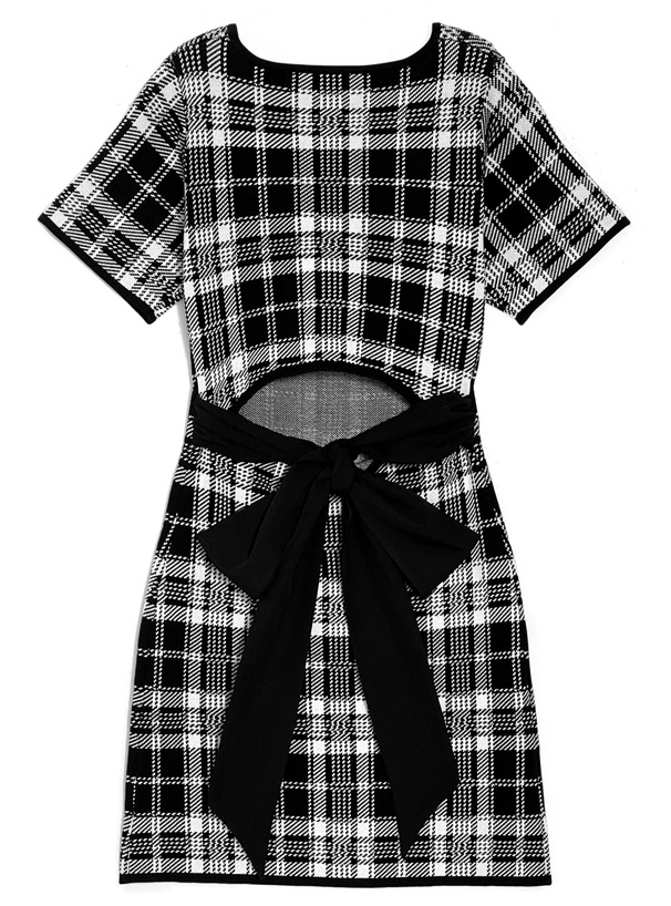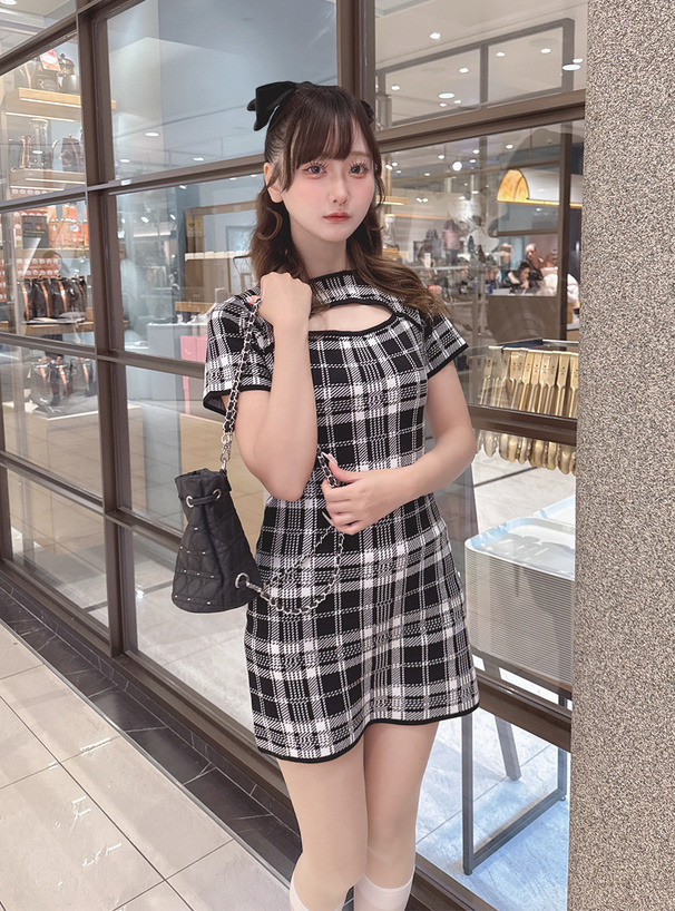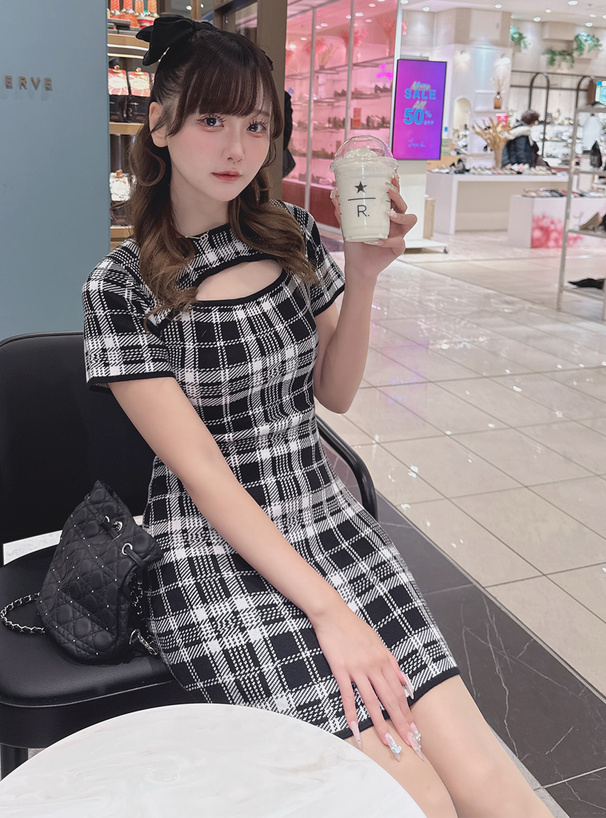 周りの視線を集めるクラシカルなチェック柄のニットワンピース。