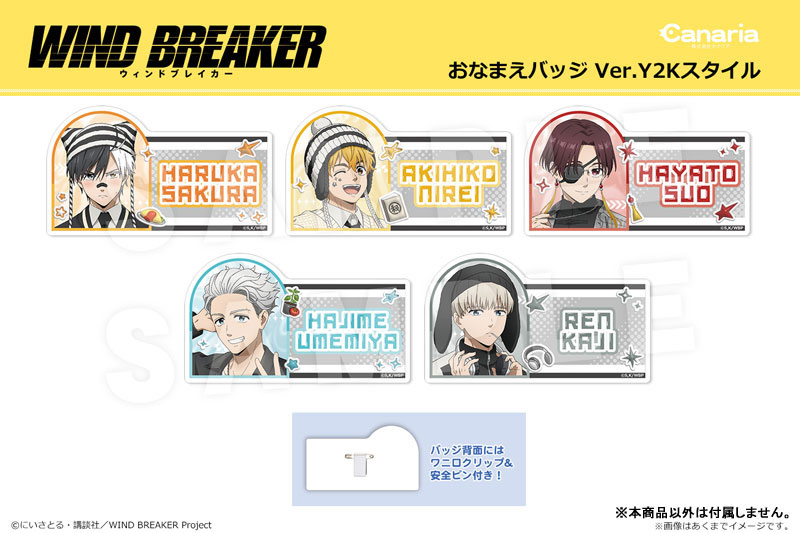 TVアニメ『WIND BREAKER』より、おなまえバッジ Ver. Y2Kスタイルが登場です! Y2Kファッションをコンセプトにした描き下ろしイラスト「Ver. Y2Kスタイル」を使用しております! 安全ピンとクリップがついており、穴を空けたくない場所にも飾ることができます!