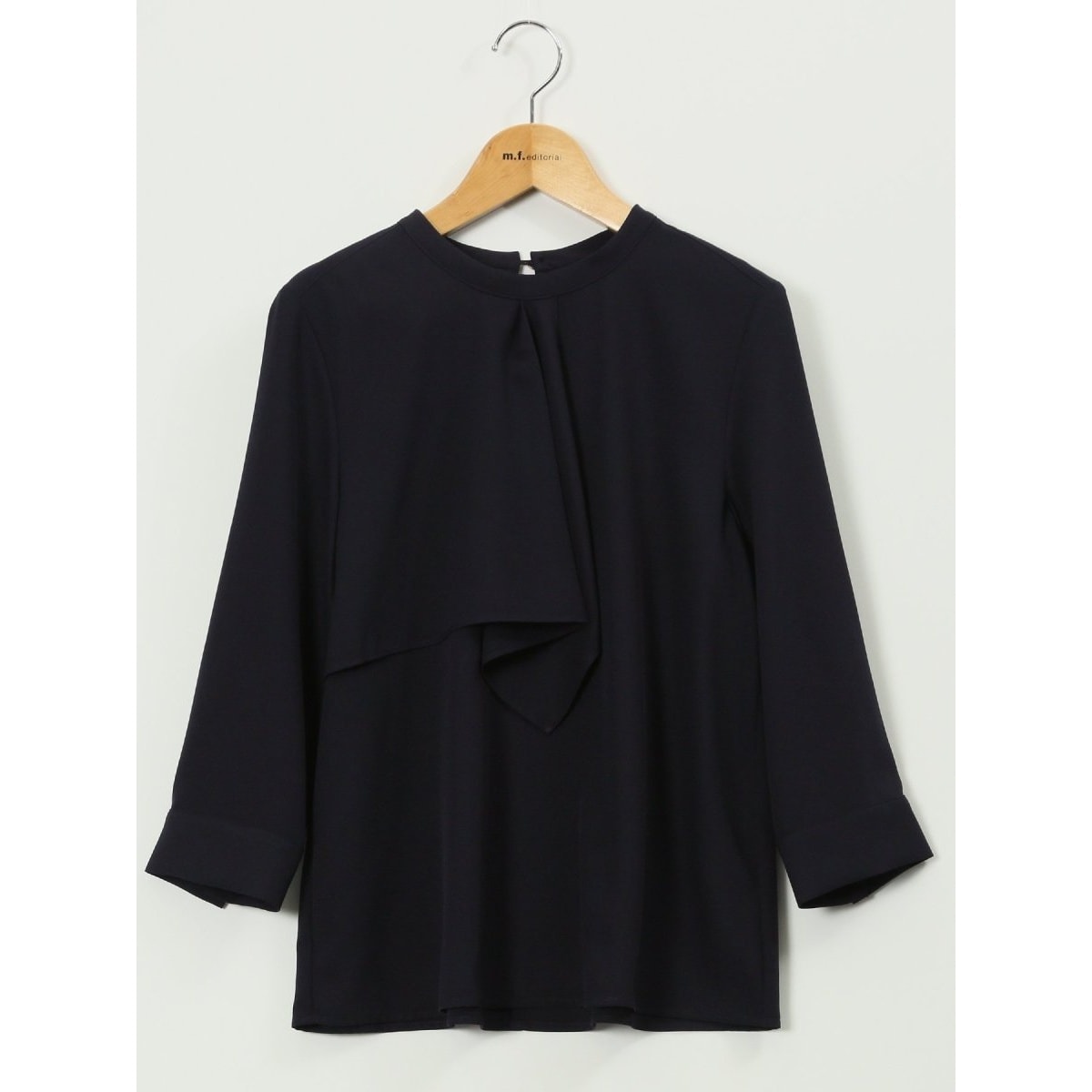 お顔まわりを華やかに演出してくれる、7分袖のプルオーバーブラウスです。ドレープ感のあるラッフルフリル、すっきりとしたバンドカラー、袖口にあしらったカフス、背中の涙開き、手首をすっきり見せる7分袖がポイント。キチンと感のあるクリーンなルックスなのでオンオフ兼用で大活躍してくれます。
