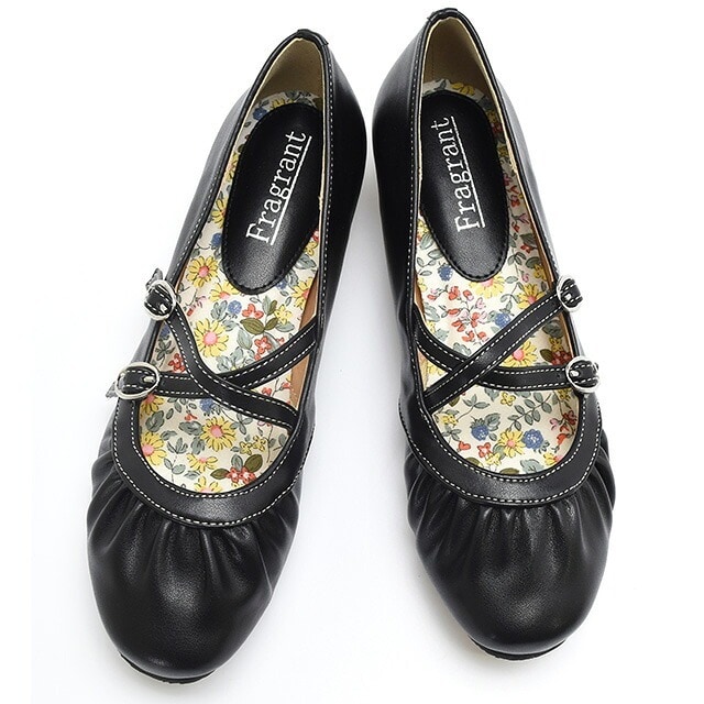 コロンと丸い、ラウンドトゥにギャザー入り。