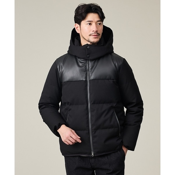 フェイクレザーとウールライクな質感の異素材使いがさりげなく主張するダウンジャケット。