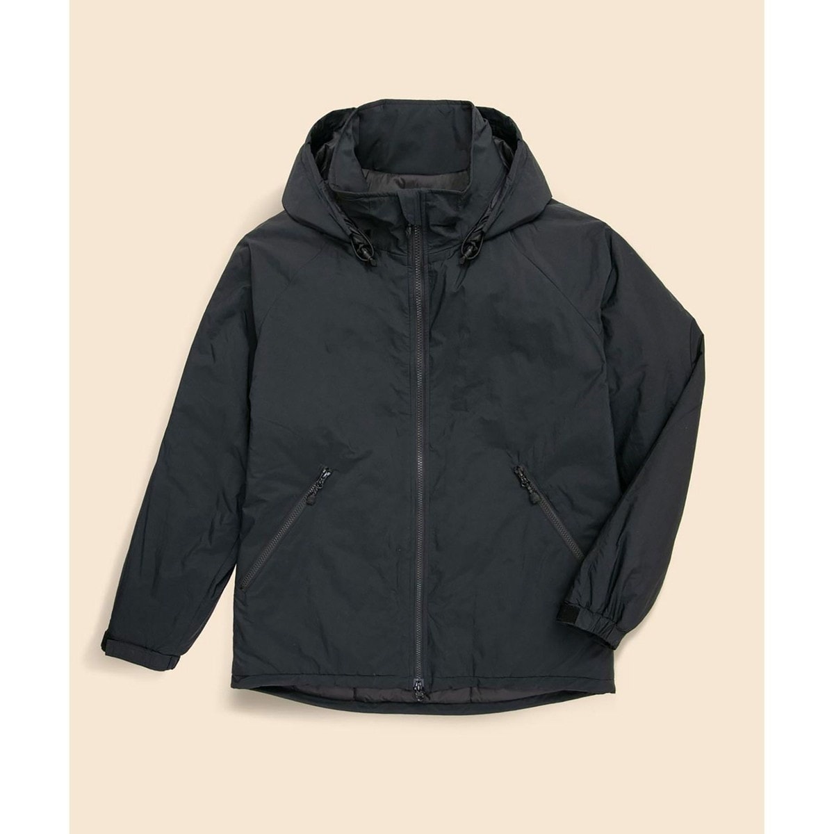 ・その他:フードあり(襟部分に収納)、裾ドローストリング、袖タブ面ファスナー開き