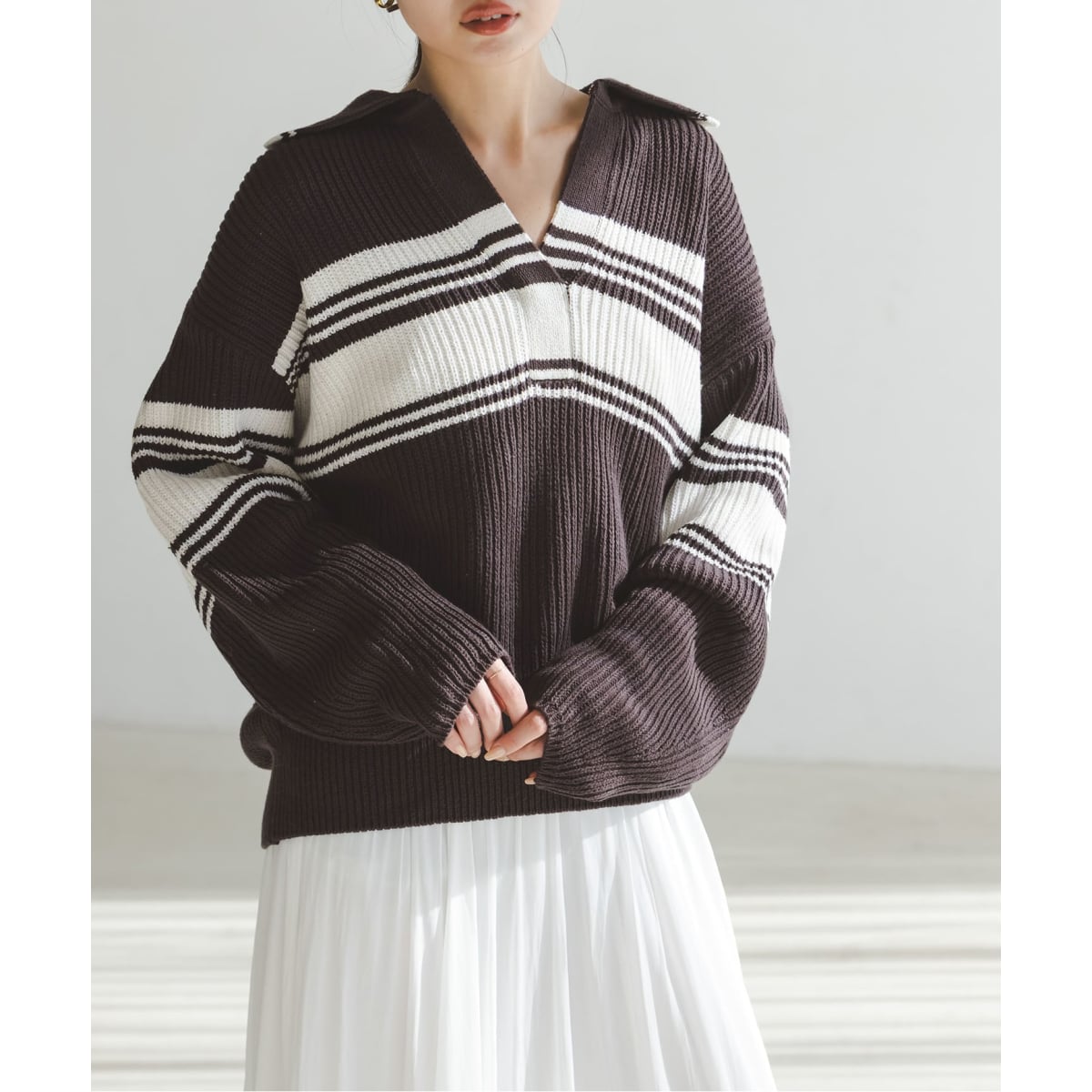 カジュアルな印象のボーダーはリズム感のあるランダムパターンに落とし込み、更に深めのVネックのパターンも加わり、女性らしい雰囲気が印象的。