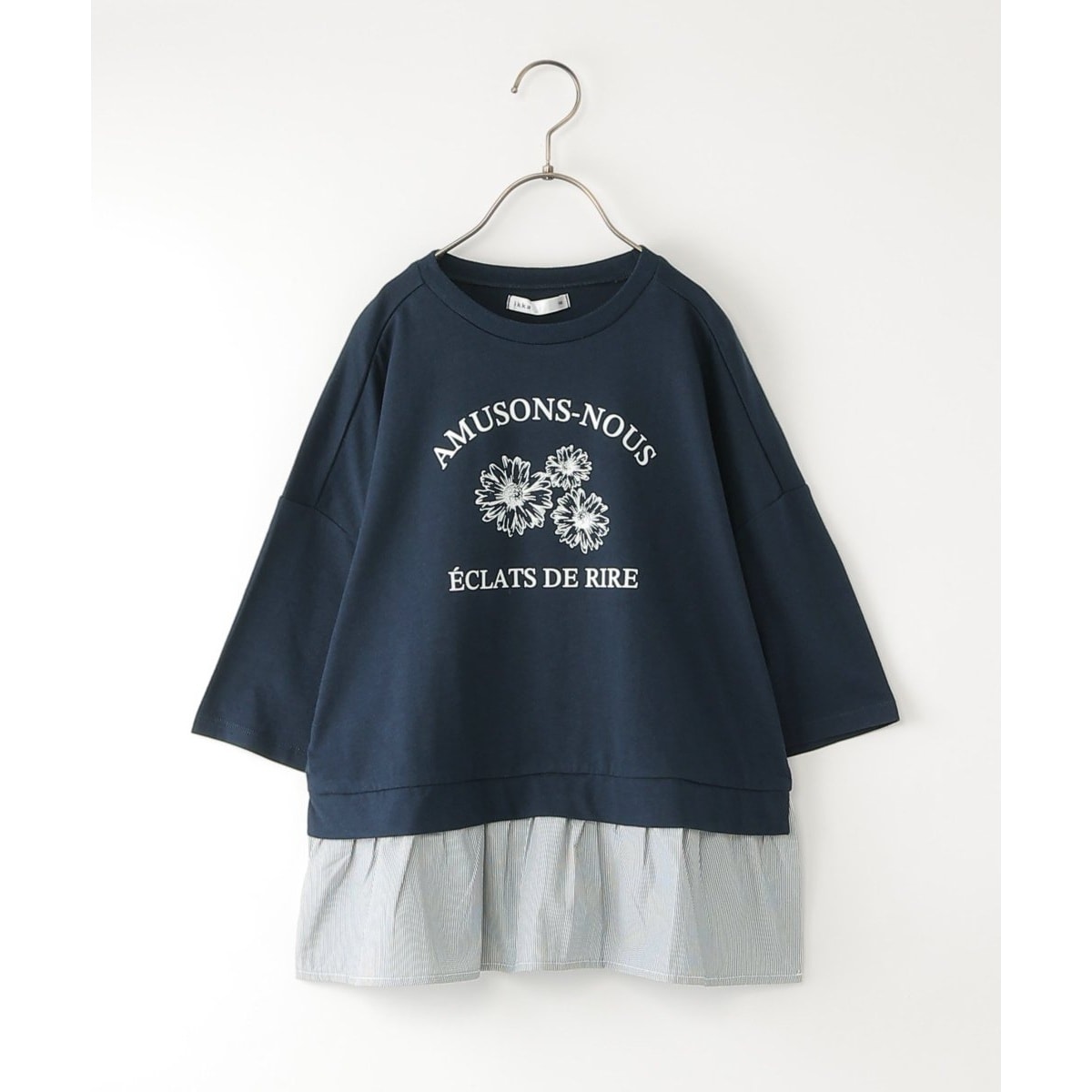 布帛ブラウスにトレーナーを重ねたような、ドッキングデザインの7分袖Tトレ。