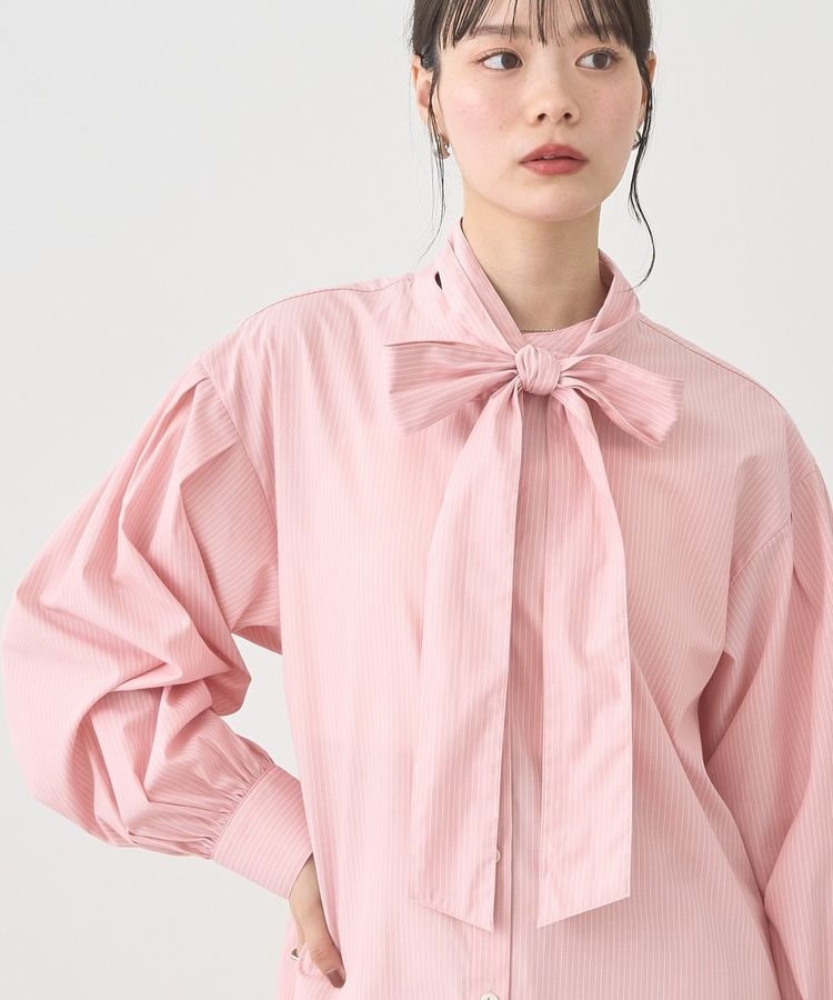 ボウタイ付きで2WAYの着こなしが楽しめるロングブラウス。ゆったりとしたオーバーサイズに長めのレングスがこなれ感のあるひと品です。汎用性の高いオフホワイトとブルーにストライプ柄を加えた3色展開。一枚さらっと着るだけできれいめなスタイリングが叶うおすすめのアイテムです。透け感[ややあり]