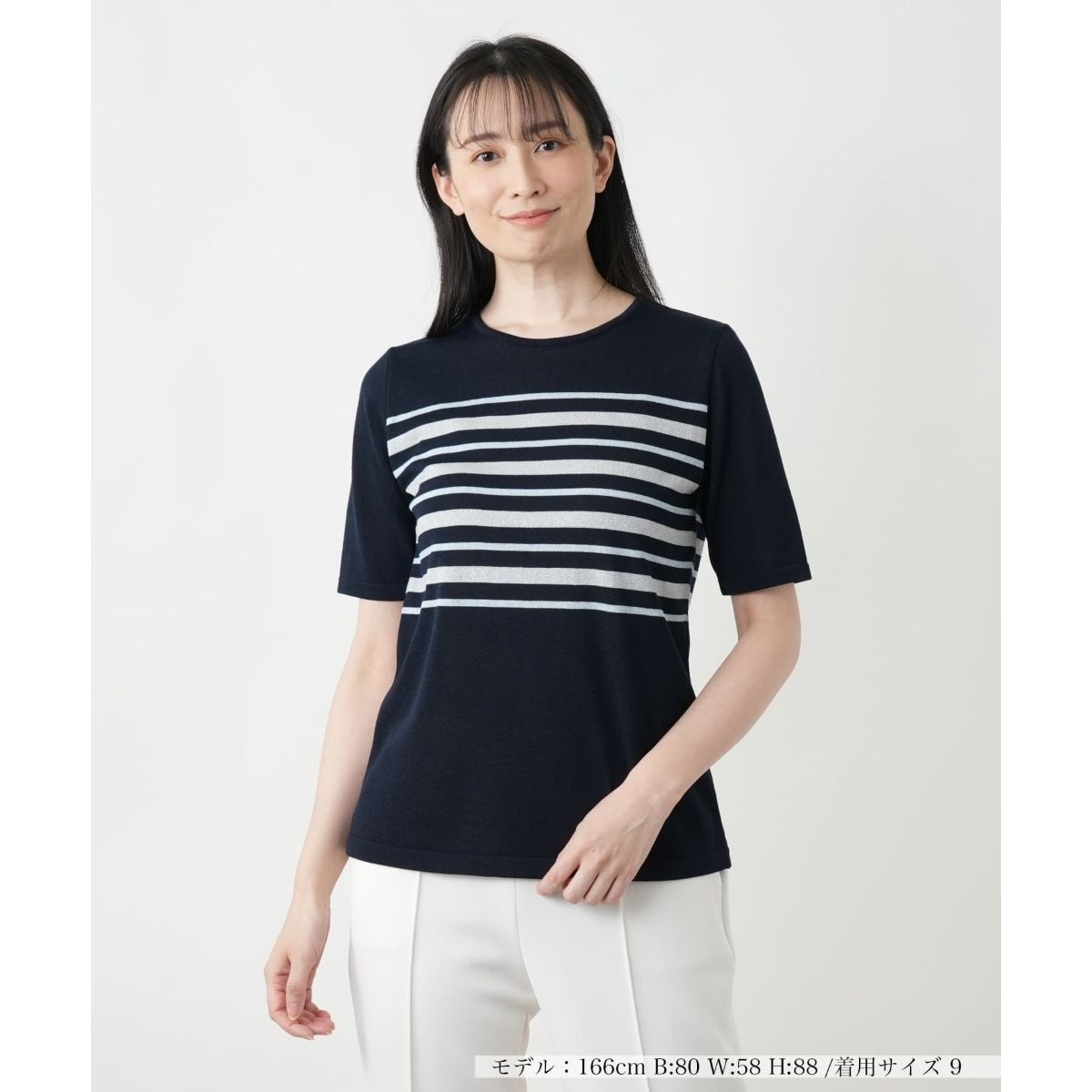 フロントからバックにかけて施された、ラメボーダーが印象的なニットプルオーバー。リズミカルなボーダーのラインが視線を惹きつけ、さりげなく個性を引き立てます。すっきりとしたシルエットが美しく、一枚でさらりと着こなすのはもちろん、ジャケットやカーディガンのインナーとしても活躍。パンツにもスカートにもバランスよく調和し、デイリーカジュアルからきれいめのスタイルまで多彩なコーデにフィットする一枚です。