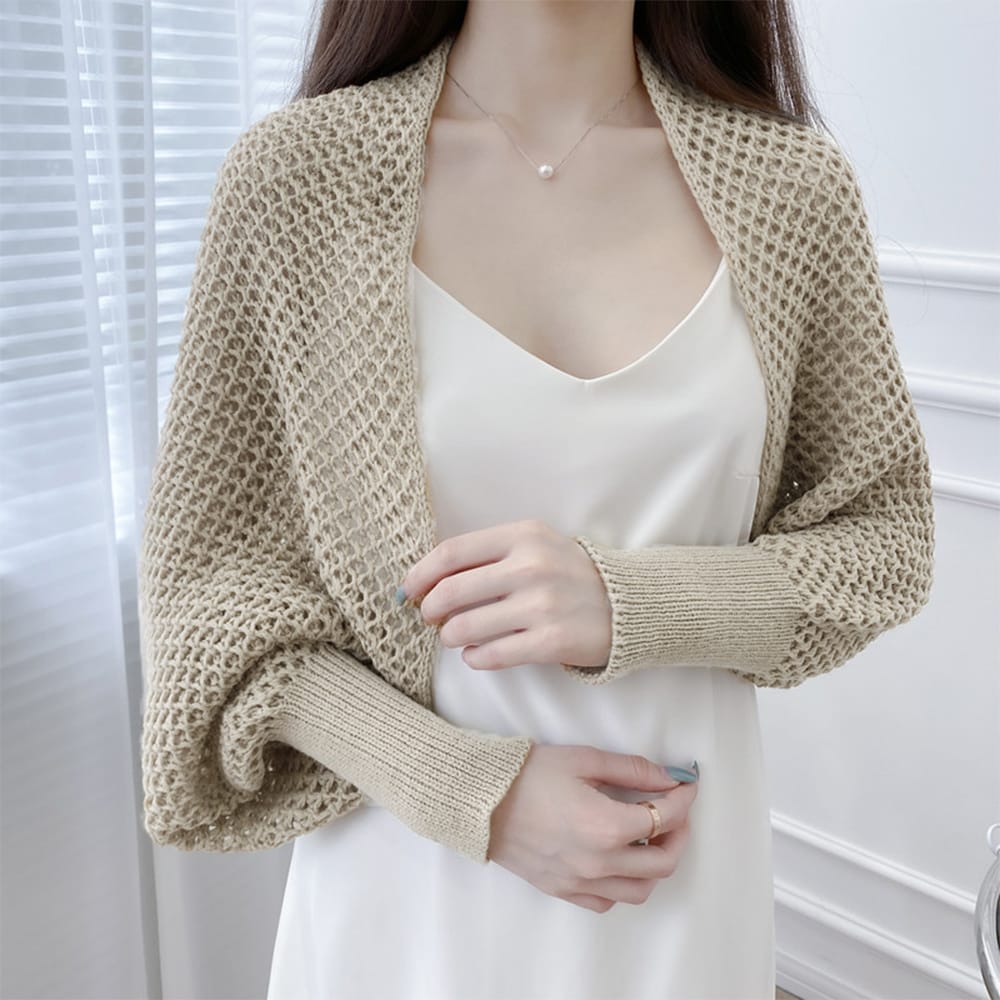 大人女性のフェミニンな透かし編みニットボレロカーディガンです