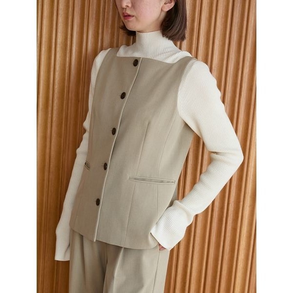 シャープな印象を与えるスクエアネックと、ボディラインに程よく沿うコンパクトなシルエットが魅力のジレ。