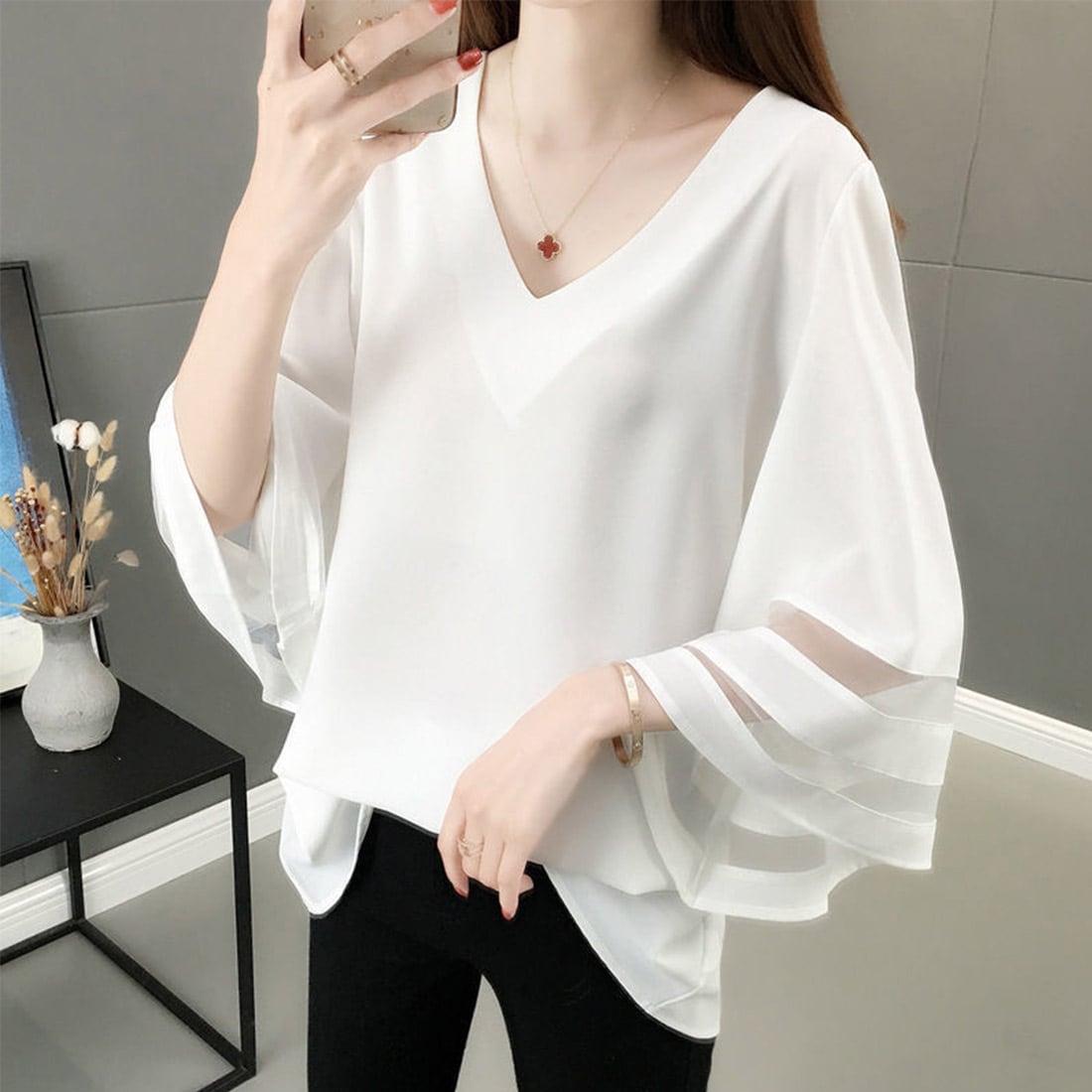 顔周りをすっきりと見せるVネックブラウスが登場!<br>
