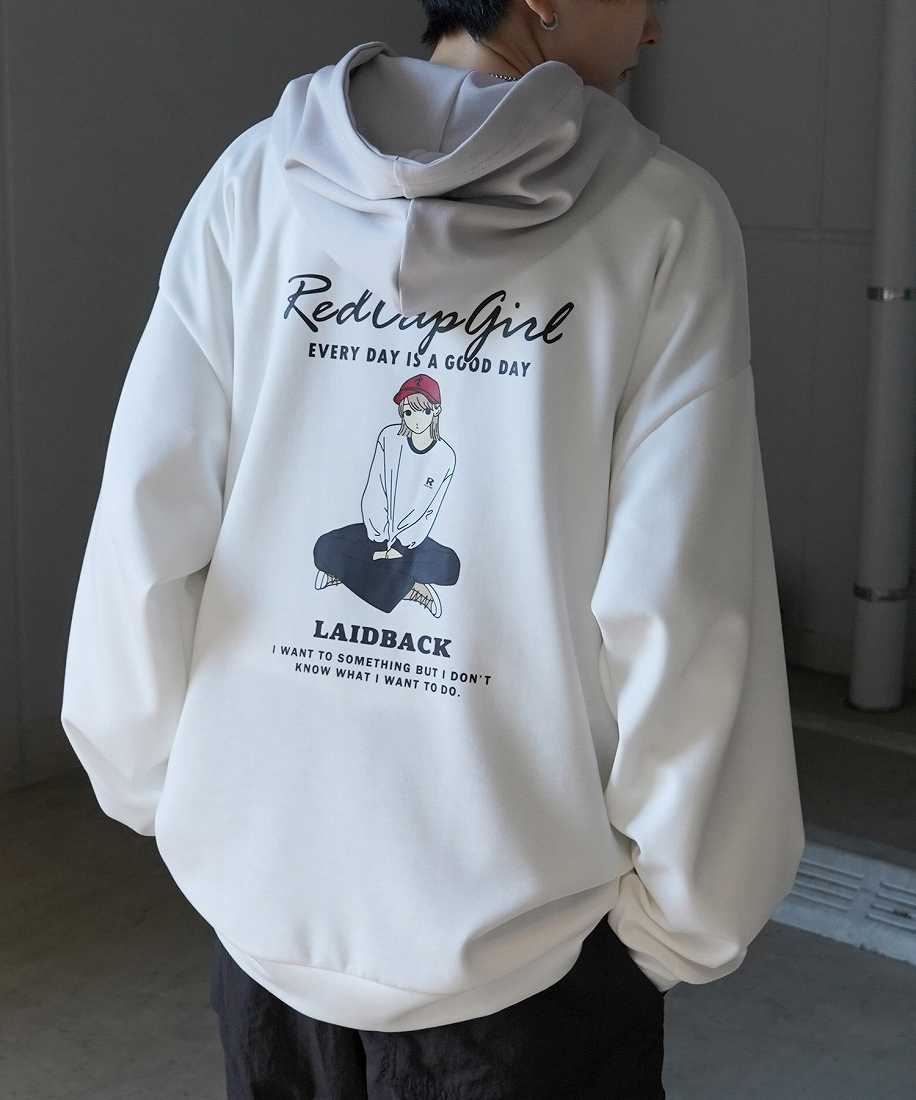 ふんわりとやわらかなタッチで描かれたRed Cap Girlが魅力のビッグシルエットプルオーバーパーカー。