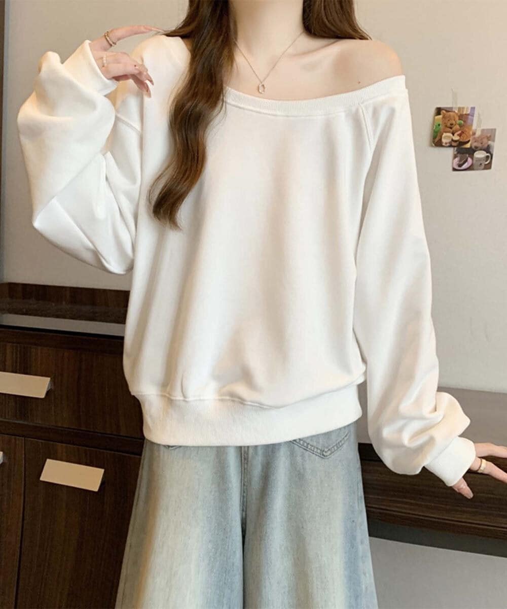 潔く開いたオフショルダーからの肌見せで女性らしい抜け感をプラスするアイテム。