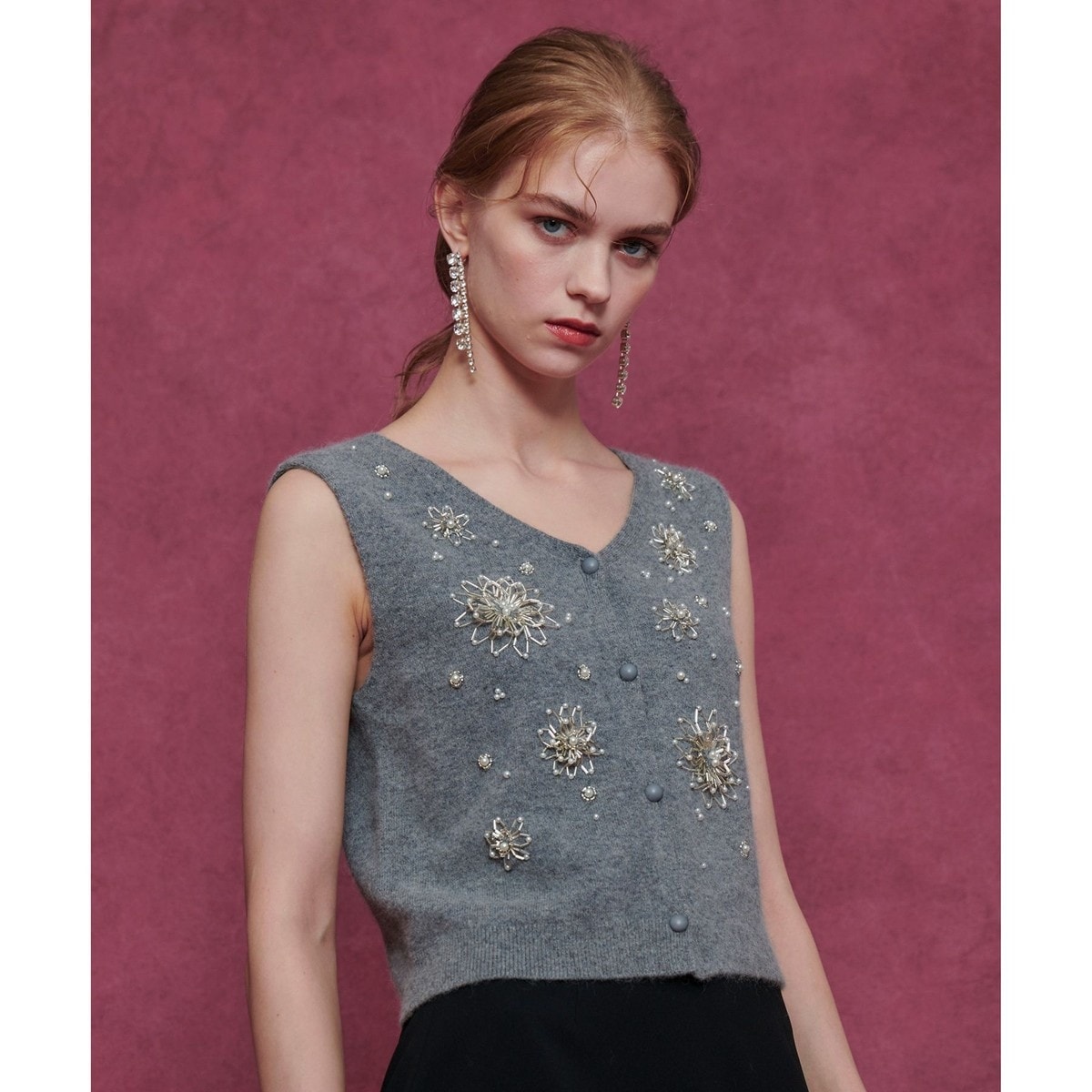 ふわふわのニットに輝くビジューとビーズが華やかな対比を魅せます。