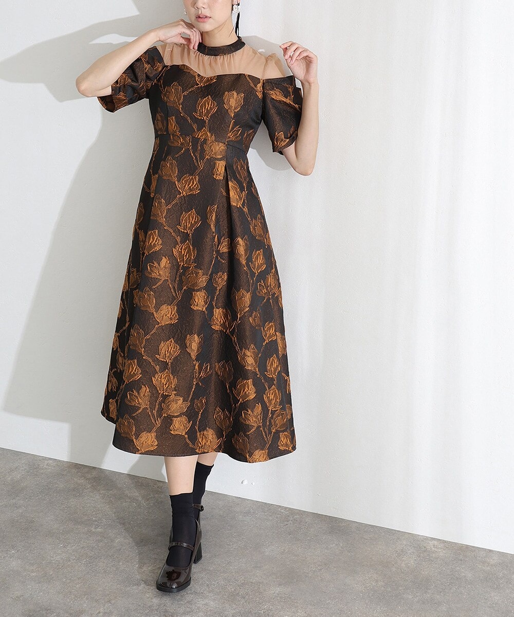 立体感あるフラワージャガードと、透け感のあるシアーを組み合わせた上品なドレス。