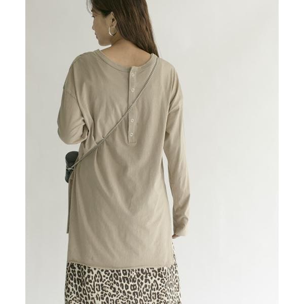背面のヘンリーデザインがポイントのカットソー。フロントはシンプルなデザインで、生地も厚すぎないのでレイヤードにも適した1着です。裾は切りっぱなしのデザインで、長めの丈と相まって程良いラフ感が◎