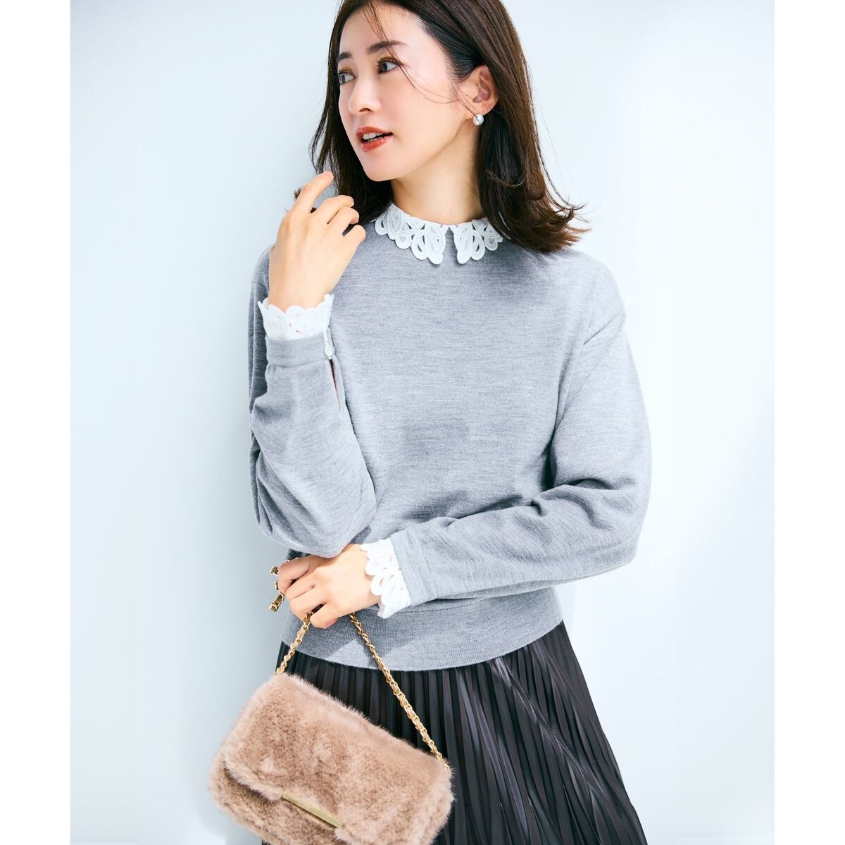 レースのブラウスをレイヤードしているようなデザインで、袖口のレースもニットと重なりを付けることでレイヤードに見えるよう工夫しました。後ろ襟ぐりにボタン空きが付いていて着脱しやすい仕様です。スカートと合わせればキュートに、パンツと合わせれば甘すぎない絶妙なバランスのコーデが完成します。カラーは、ライトグレー(#003)、ブラック(#005)、ネイビー(#075)の3色展開です。