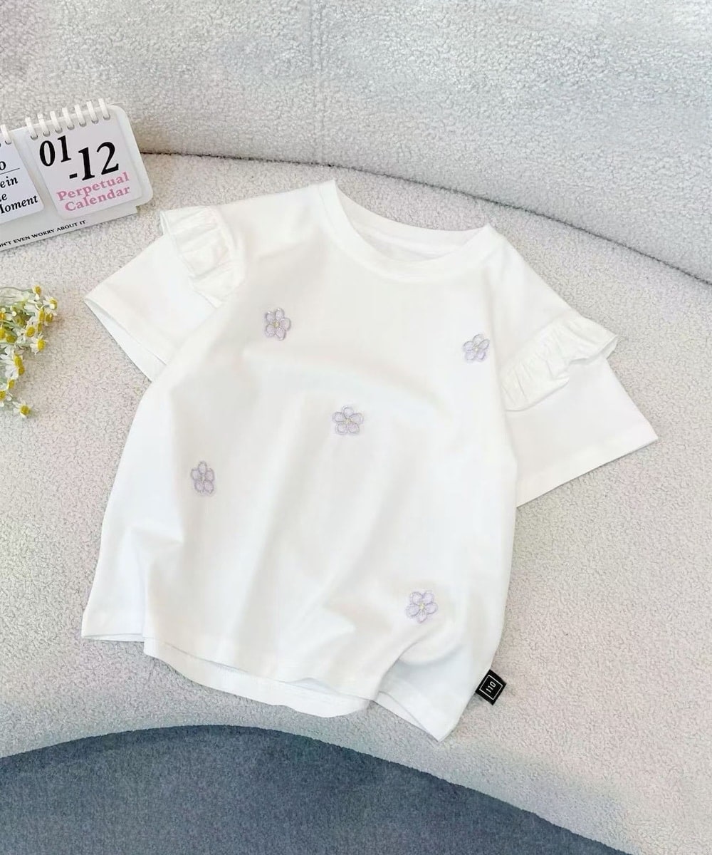 袖口のフリルデザインが可愛らしさを引き立てる、ガーリーな印象のTシャツ。全体にちりばめられた小さなお花の刺繍がポイントです。
