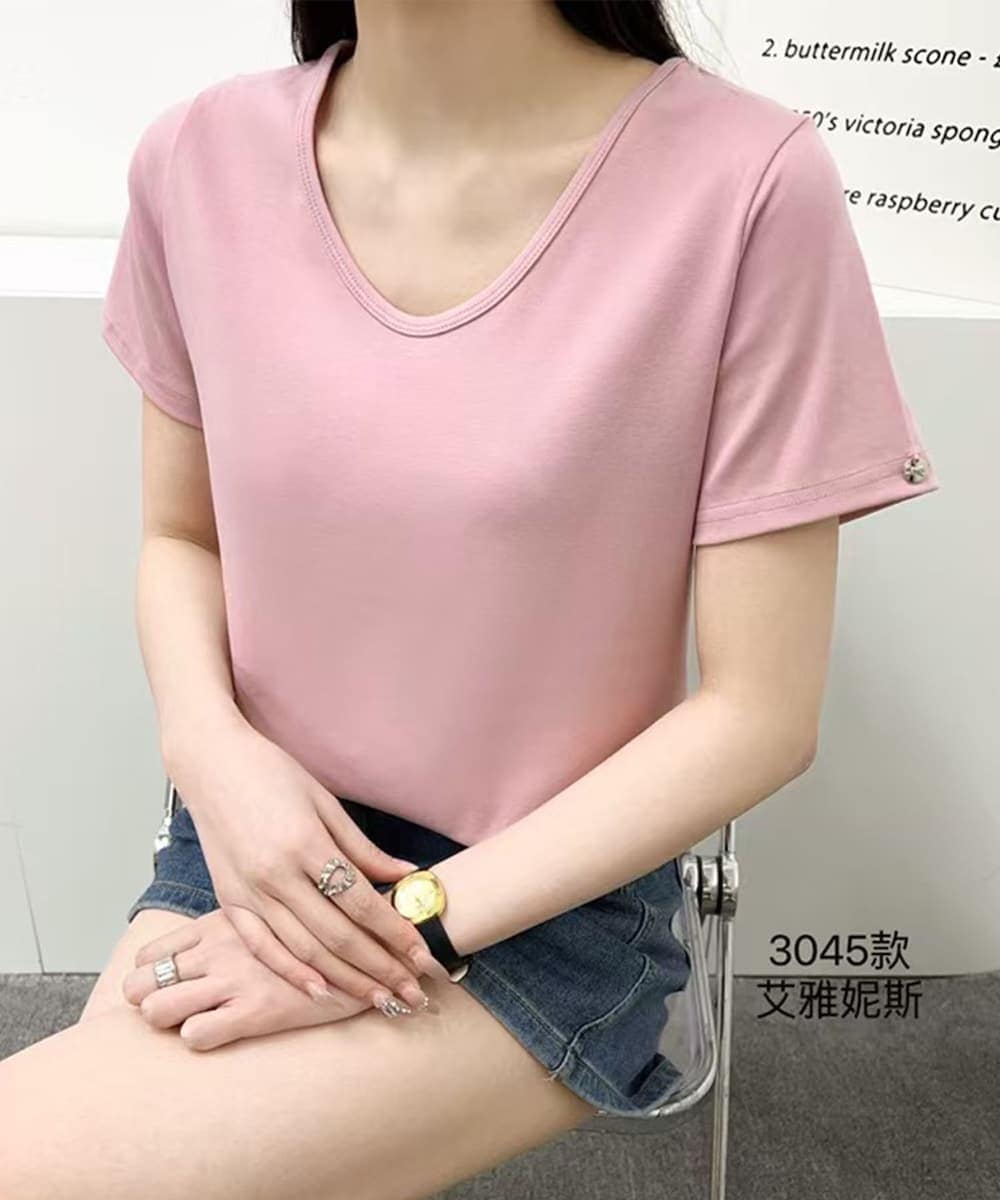 デコルテラインを美しく見せてくれるUネックデザインが魅力のTシャツ。シンプルながらも女性らしいニュアンスを感じさせる一枚です。