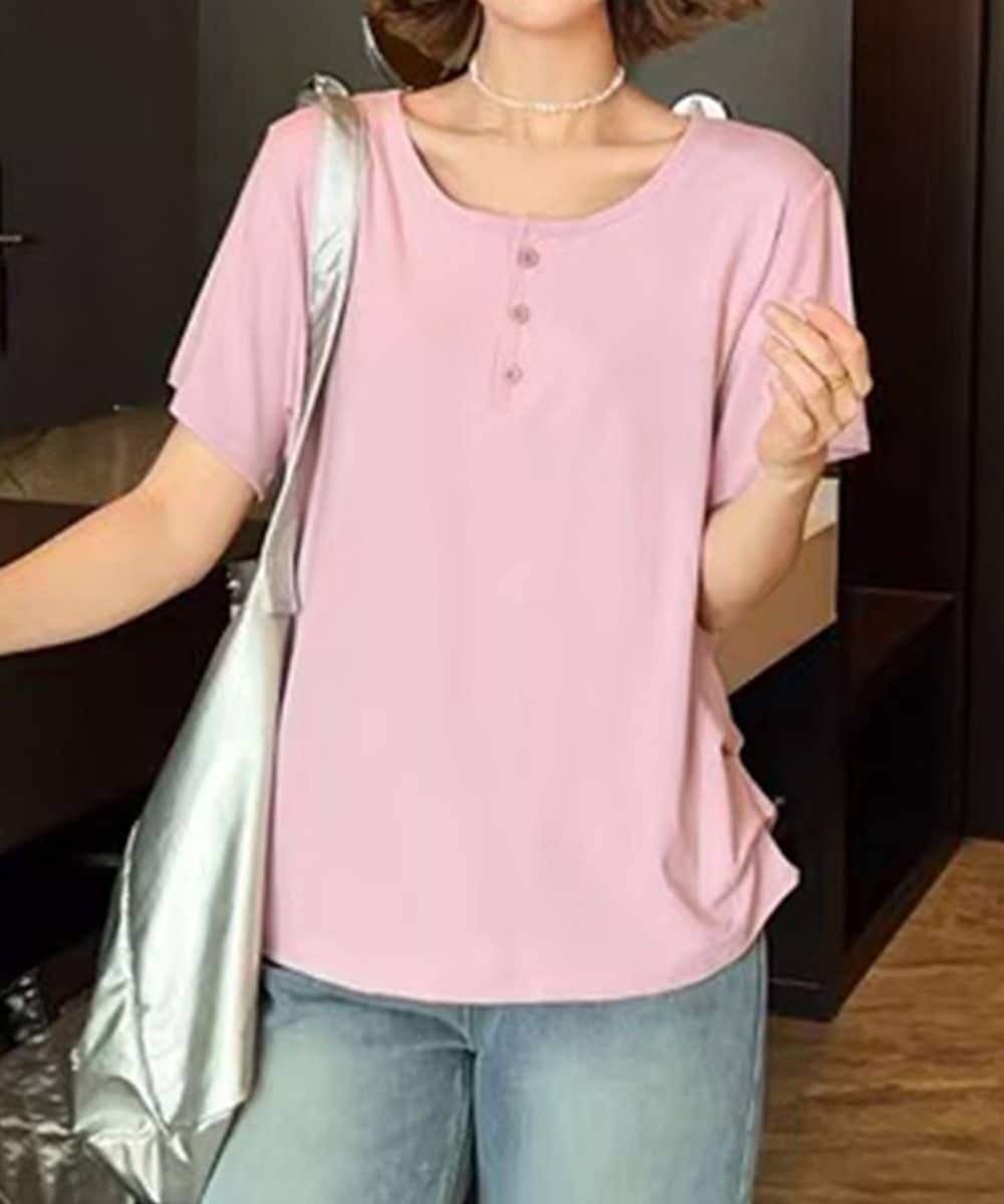 フロントにあしらわれたミニボタンがアクセントになった、ナチュラルな雰囲気のTシャツ。シンプルながらもディテールにこだわった一枚で、着こなしにさりげない変化を与えてくれます。