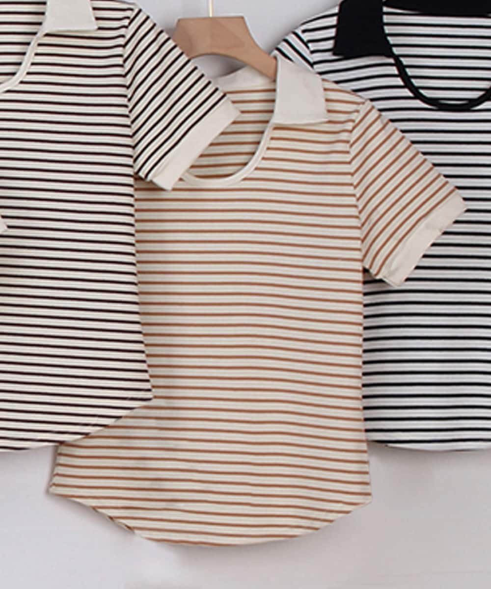 カジュアル感たっぷりのボーダーデザインに、襟元と袖口の配色がアクセントになったクルーネックTシャツ。コンパクトながら程よいゆとりがあり、体のラインを拾いすぎない着心地です。