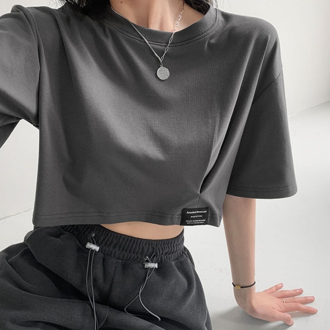 ローウエストのボトムスを合わせてお腹を少し見せるようなスタイルも、おすすめです。<br>